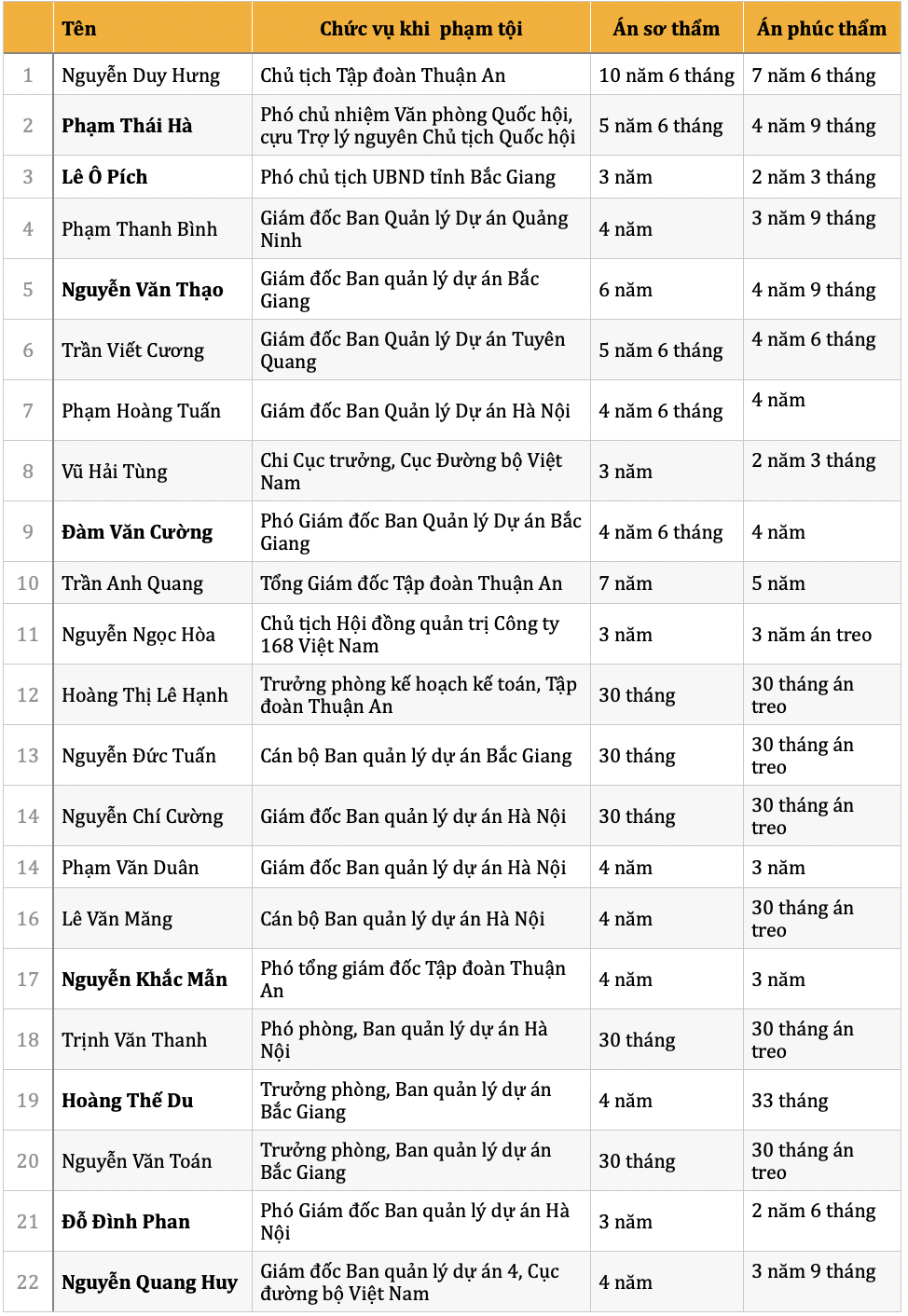 The first-instance verdict stated that Ha's introduction and influence "created favorable conditions for Thuan An to win bids", indirectly leading to individuals at the Bac Giang Project Management Board, along with the design unit and Thuan An, colluding and conspiring to secure contracts.