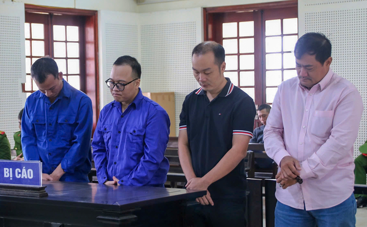 Defendant Hoang Hiep (wearing glasses) and three accomplices in court. Photo: Duc Hung |