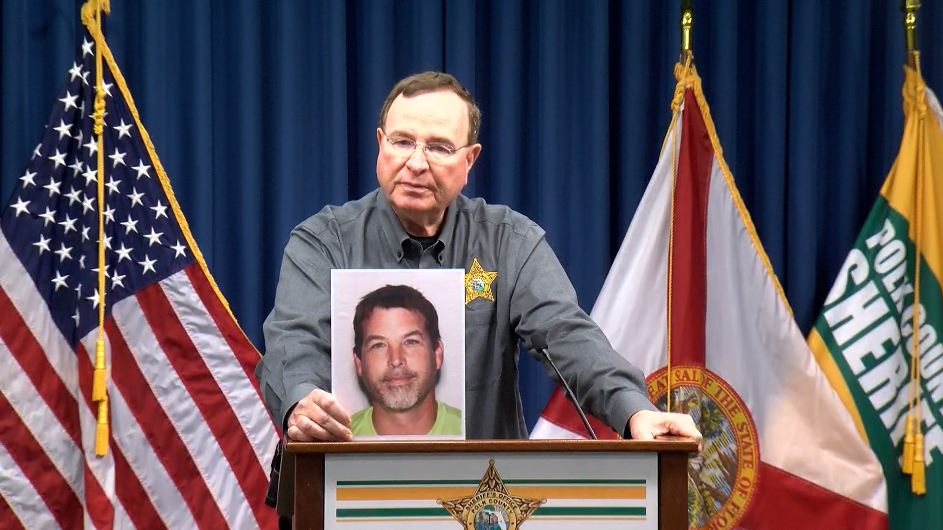 Polk County Sheriff Grady Judd holds a photo of Jason Kenney during a press conference on 23/12. Photo: NewsNation