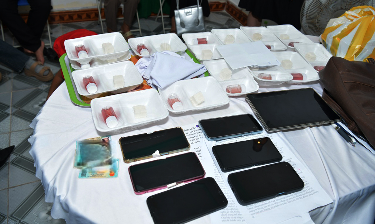 Police interrogated leader Nguyen Duy Cuong, 7 active supporters, and 41 related individuals. Seized evidence includes: 8 laptops, 31 mobile phones, one tablet, 7 scriptures, 33 types of lecture materials related to the "Passover ceremony", offering money, and other documents.
