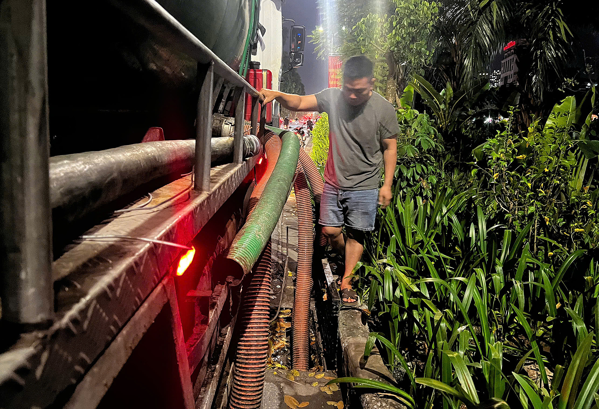 Around 3 a.m. on 5/9, Dao's employees pumped liquid waste from the septic tank of a building on Nguyen Chi Thanh street. Dao then directed Cuong to drive the tanker truck to Lang street, open a manhole cover, insert a hose, and discharge all 50 cubic meters of untreated waste.