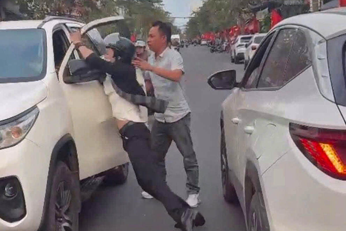 Vu (in a black jacket) attacked with his hands before using a helmet to continue injuring the car driver. Photo: Thanh Huynh