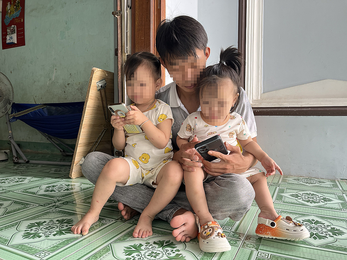 Tran Huynh Kiet and his two young children at their rented house in Ninh Hoa ward. Photo: Sao Mai