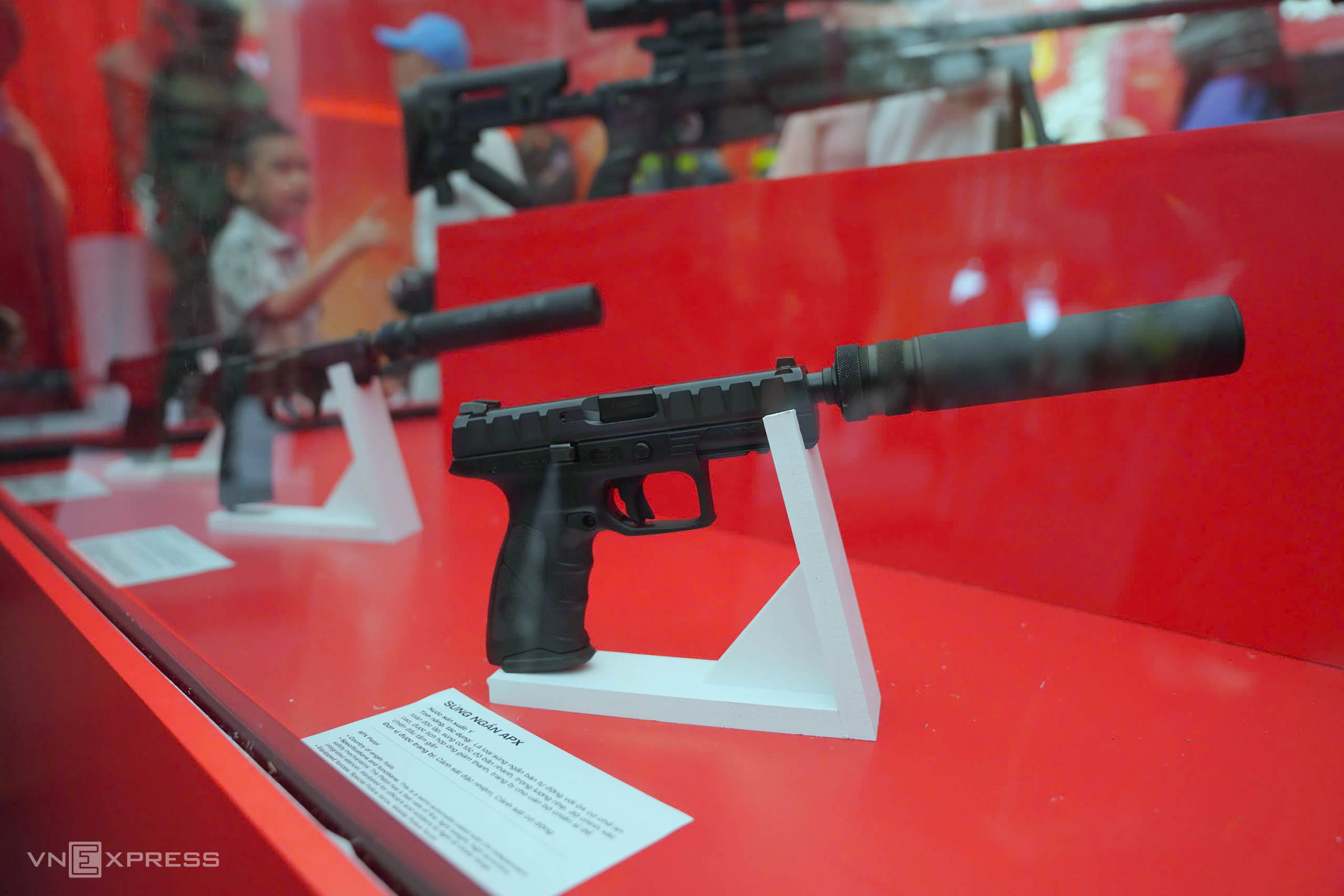 The APX pistol: a semi-automatic handgun made of polymer and steel, lightweight yet durable. It features a trigger safety, firing pin block, and drop safety. It operates via a gas-operated short-stroke piston system and is equipped with a suppressor for close-quarters combat. |