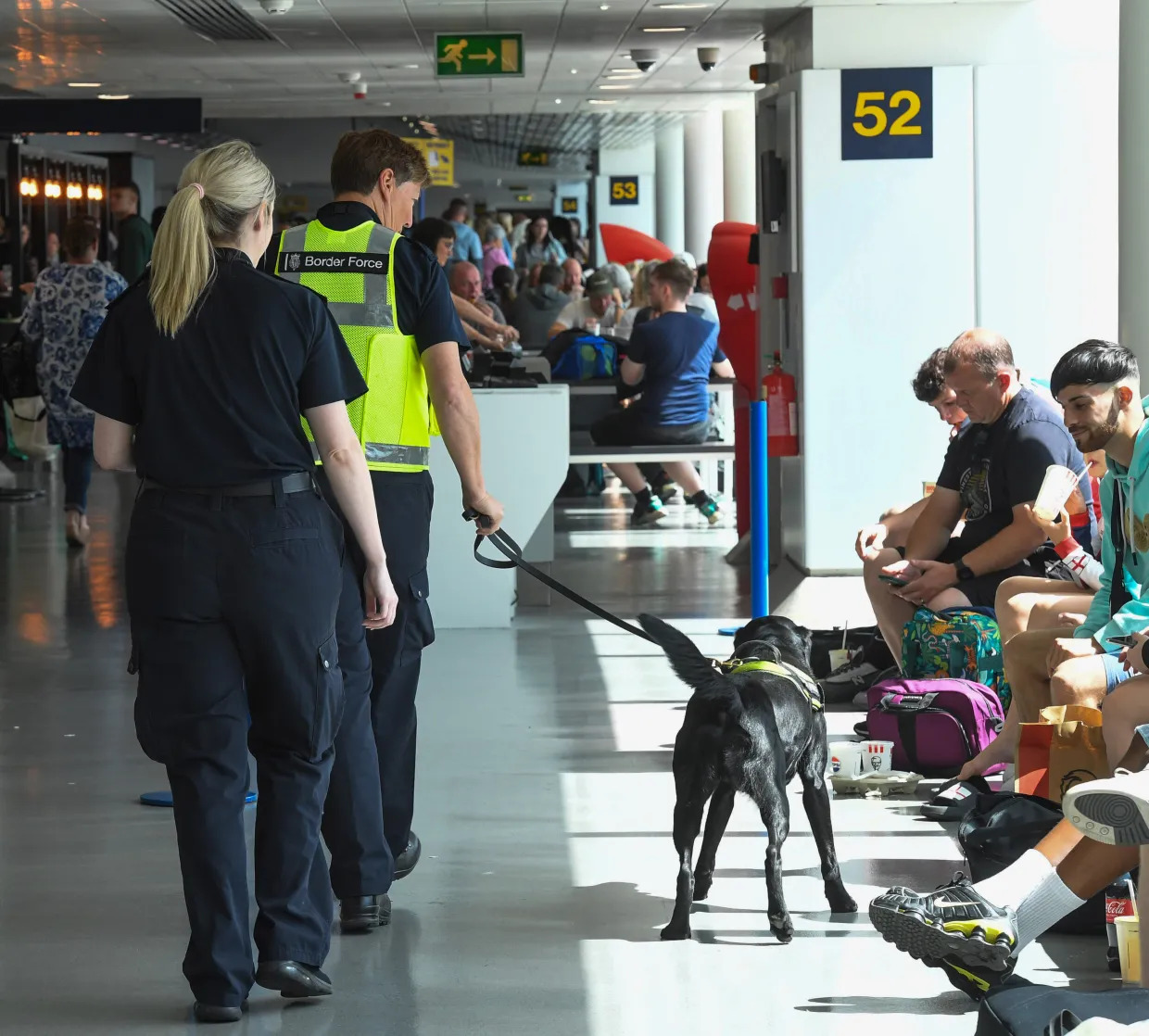 UK Border Force officers with sniffer dogs patrol Manchester Airport. *Image: Kelvinmedia* |