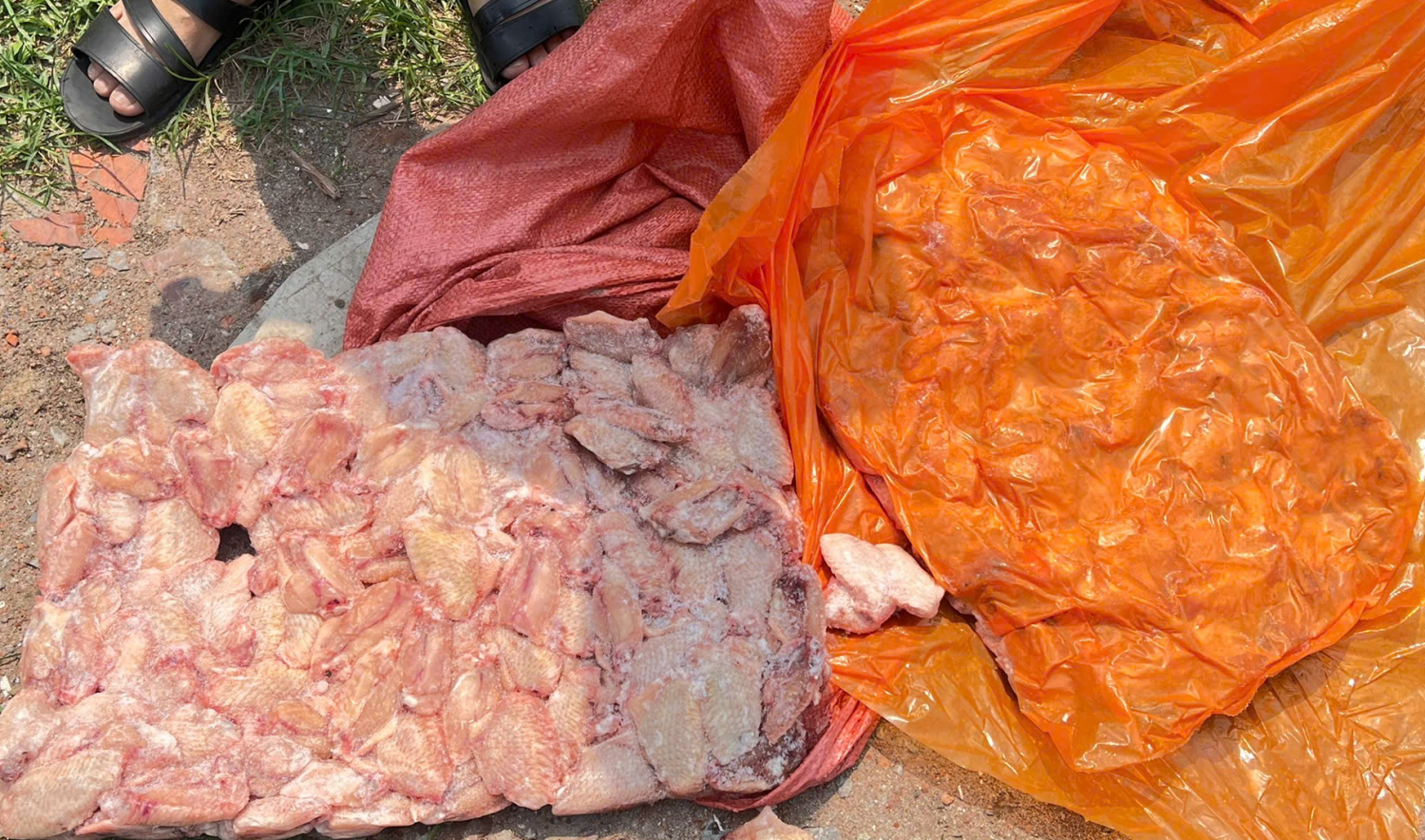 Over 10,5 tons of foul-smelling, spoiled frozen chicken wings and feet were found in a warehouse in Mong Cai ward. *Photo: Police provided.* |