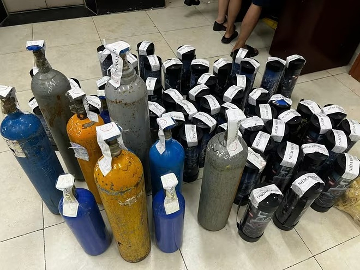 In the early morning of 18/11, police simultaneously raided the Monaza karaoke bar at 194 Tran Duy Hung street, Yen Hoa ward. They found 11 active karaoke rooms, with four containing customers using laughing gas.