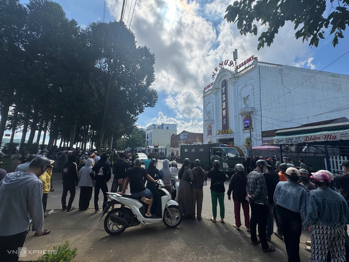 Hundreds of people watch as police make arrests at Venus karaoke. Photo: Pham Linh |