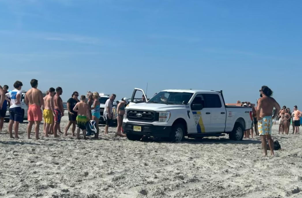 Witnesses helped lift the Wildwood police pickup truck to rescue the woman who was run over while lying on the beach on 24/8/2024. *Photo: NJ* |