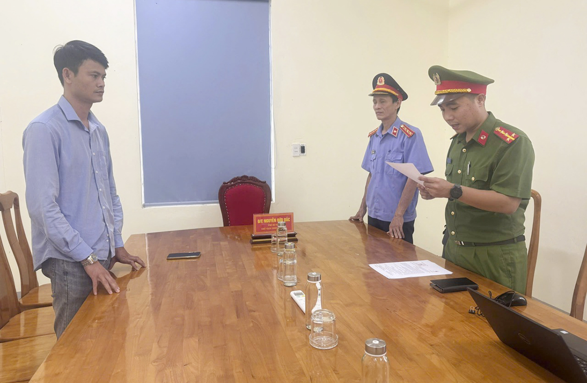 The investigative police agency served the indictment decision to Nguyen Son Tung (left). Photo: Quang Tri Provincial Police