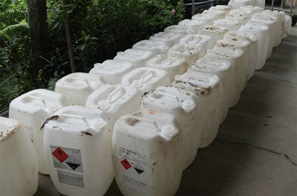Plastic jerrycans containing industrial acetic acid purchased by Loc for mixing and producing fake vinegar. Photo: Police provided