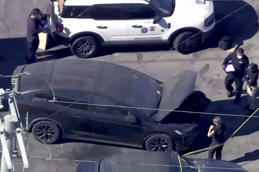 The victim's body parts were placed in two plastic bags inside the Tesla. *KTLA* |
