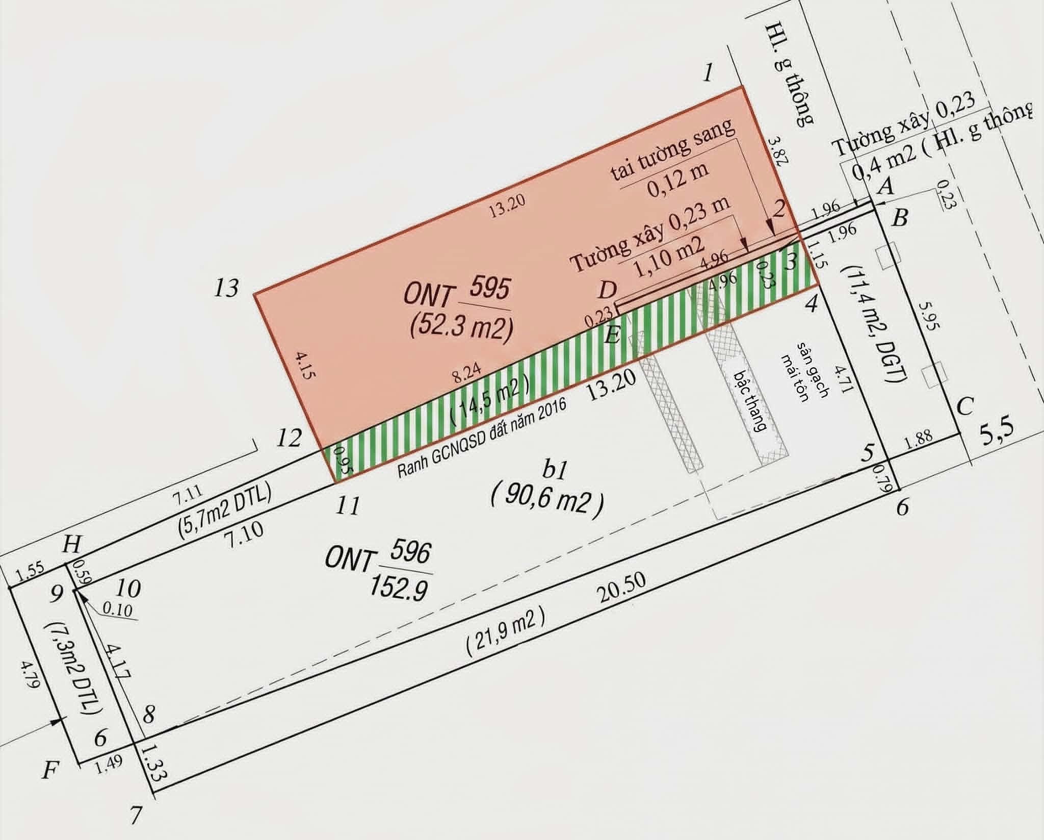 Ms. Hai's land, now 52 square meters (orange), after her elder sister's house encroached on 14,5 square meters (blue stripes). |