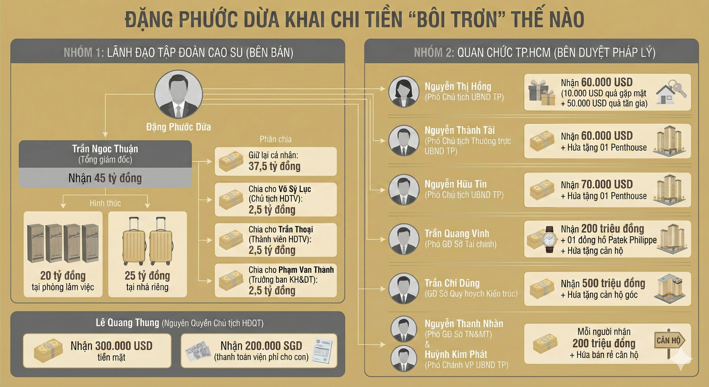 Dua also claimed to have given Tran Chi Dung (Director of the Department of Planning and Architecture) 500 million VND and promised him a completed corner apartment in the project; given Nguyen Thanh Nhan (Deputy Director of the Department of Natural Resources and Environment) 200 million VND and promised to sell him an apartment at a preferential price in the project; and given Huynh Kim Phat (Deputy Chief of Office of the Ho Chi Minh City People's Committee) 200 million VND and promised to sell him an apartment at a preferential price in the project.