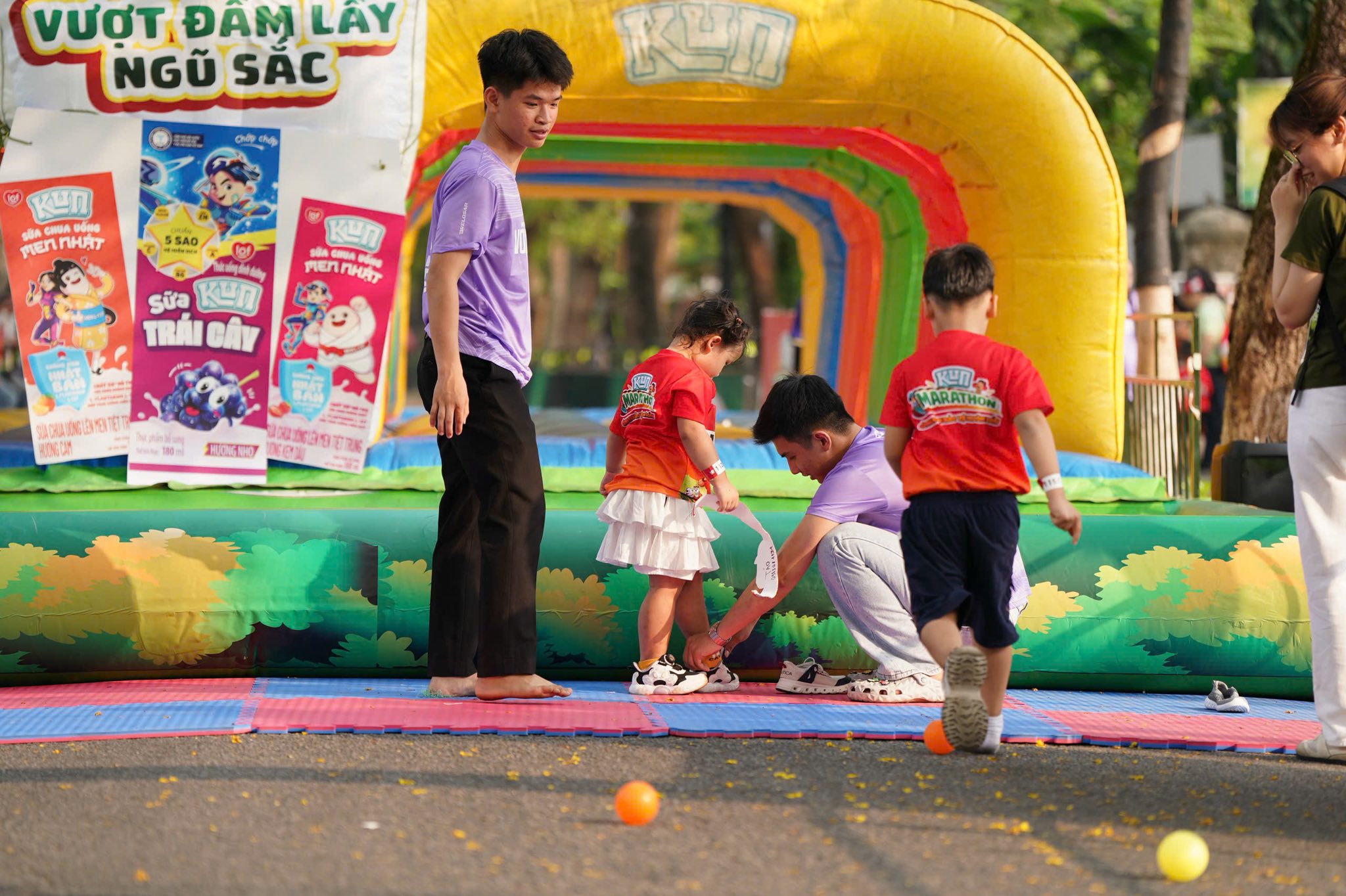 The weather in Hue on the morning of 18/4 was sunny and humid. Many parents came prepared with handheld fans to help cool down their children. Participants, including a 7-year-old girl in a feminine lace dress, exerted themselves on the course. Ensuring children wore well-fitting athletic shoes and proper sun protection was crucial for their safety while exercising under the sun.