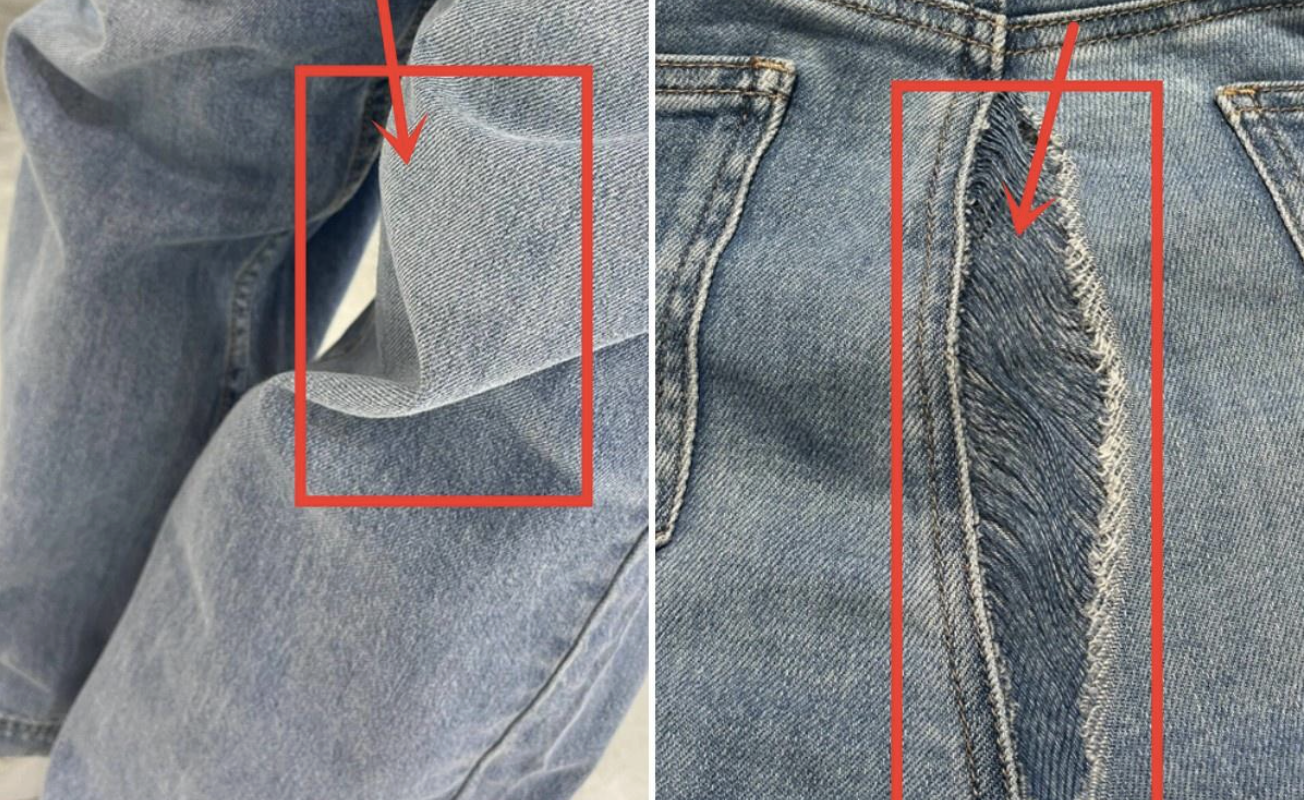 Bagging at the knees and tearing at the seat are often due to low-quality denim fabric not made with ideal component ratios. *Photo: Zhuanlan* |