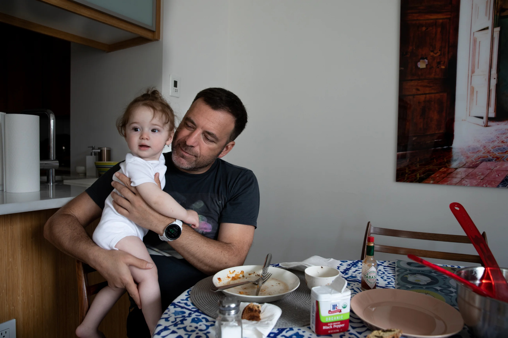 Single father Cenk Bulbul with his daughter, born in 2021 in New York. Bulbul had both of his daughters through surrogacy using donor eggs and his own sperm. Photo: Jackie Molloy |