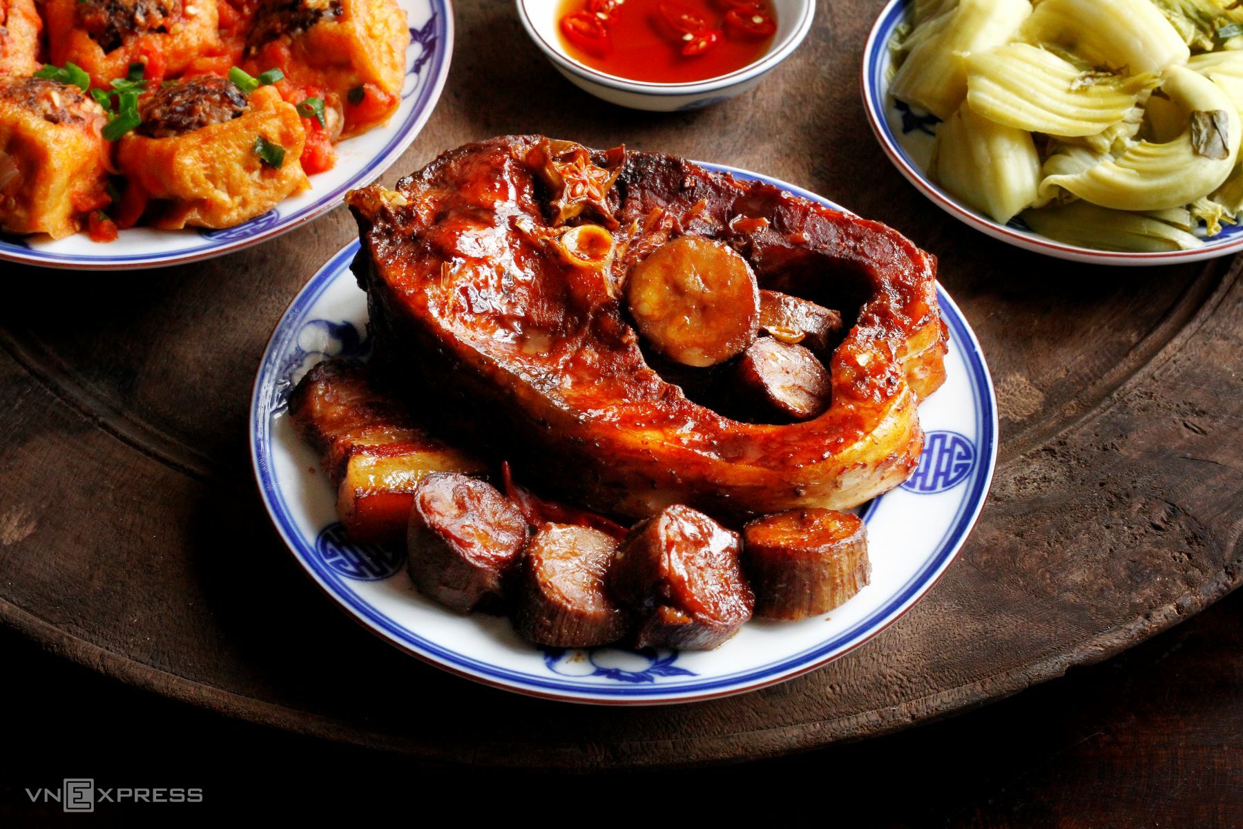 To prepare, clean the fish thoroughly to remove any fishy odor, then marinate it generously with traditional seasonings like fish sauce, caramel sauce, Ban fermented soybean paste, pepper, and chili. Braise the fish with green bananas, galangal, ginger, lemongrass, and a touch of pork belly to keep it tender. A two-stage braising process ensures the fish is firm and deeply flavored, making it suitable for cooking in larger batches to enjoy over several meals, which is both delicious and cost-effective.