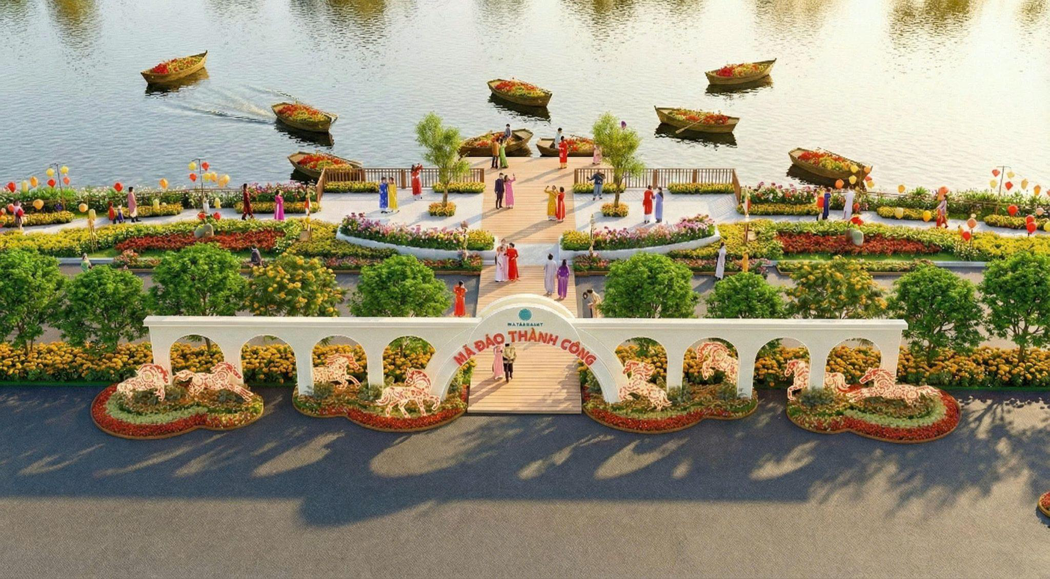 The 200 m stretch along the Vam Co Dong river is transformed with spring flowers and miniature landscapes. The welcome gate for the year of Binh Ngo (Horse) features galloping horses, creating a visual highlight and evoking the spirit of new beginnings and dynamism for the new year.