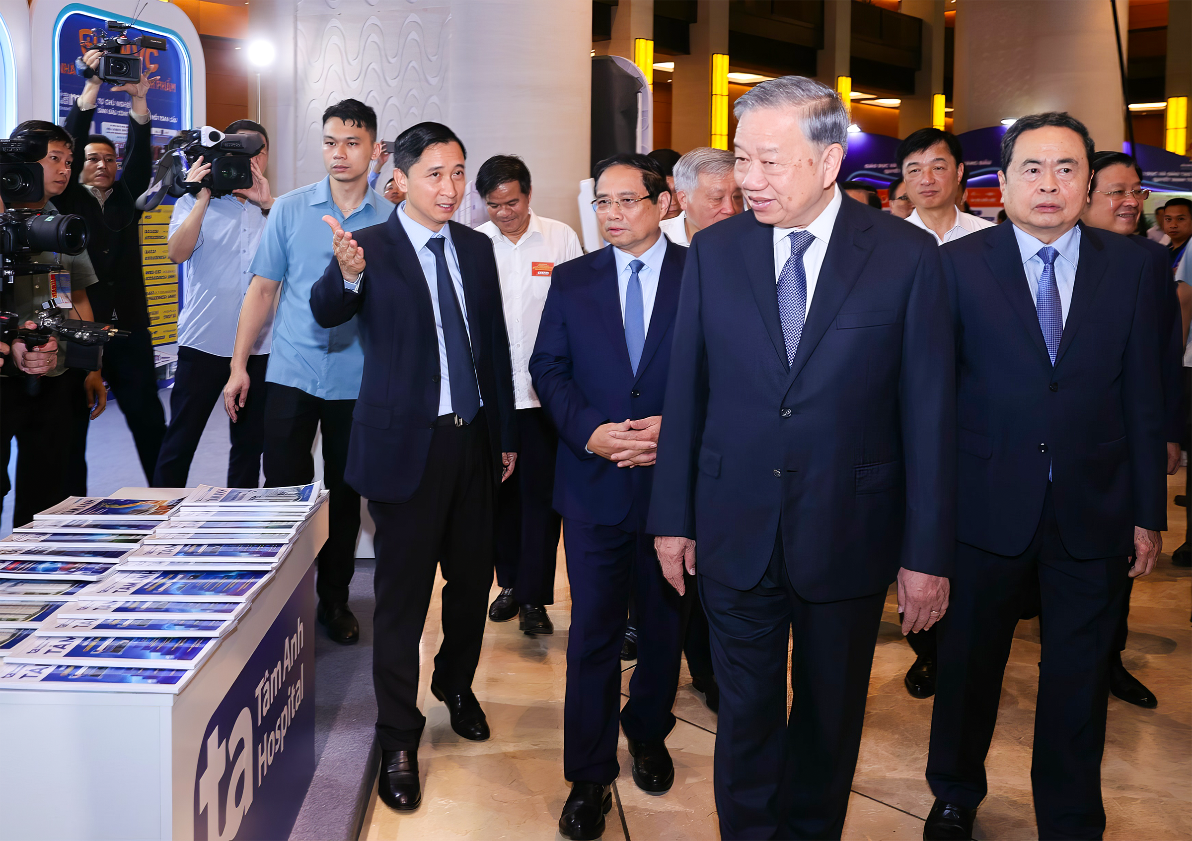 General Secretary To Lam and other high-ranking Party and State leaders listen to Mr. Ngo Chi Dung introduce the technologies of the Tam Anh General Hospital System at the exhibition. Photo: Nhat Bac
