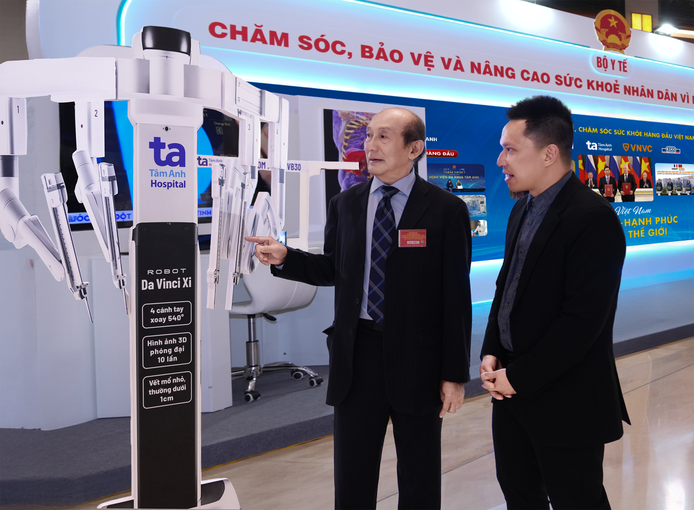 Associate Professor, Doctor Vu Le Chuyen (left) introduces the features of the Da Vinci Xi surgical robot. Photo: Tam Anh General Hospital