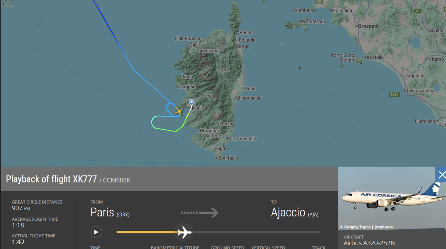 Air Corsica flight XK777 departed Orly Airport in Paris at 9:50 PM on 15/9 and was scheduled to land at Ajaccio Napoleon Bonaparte Airport on the Mediterranean island of Corsica at 11:25 PM.
