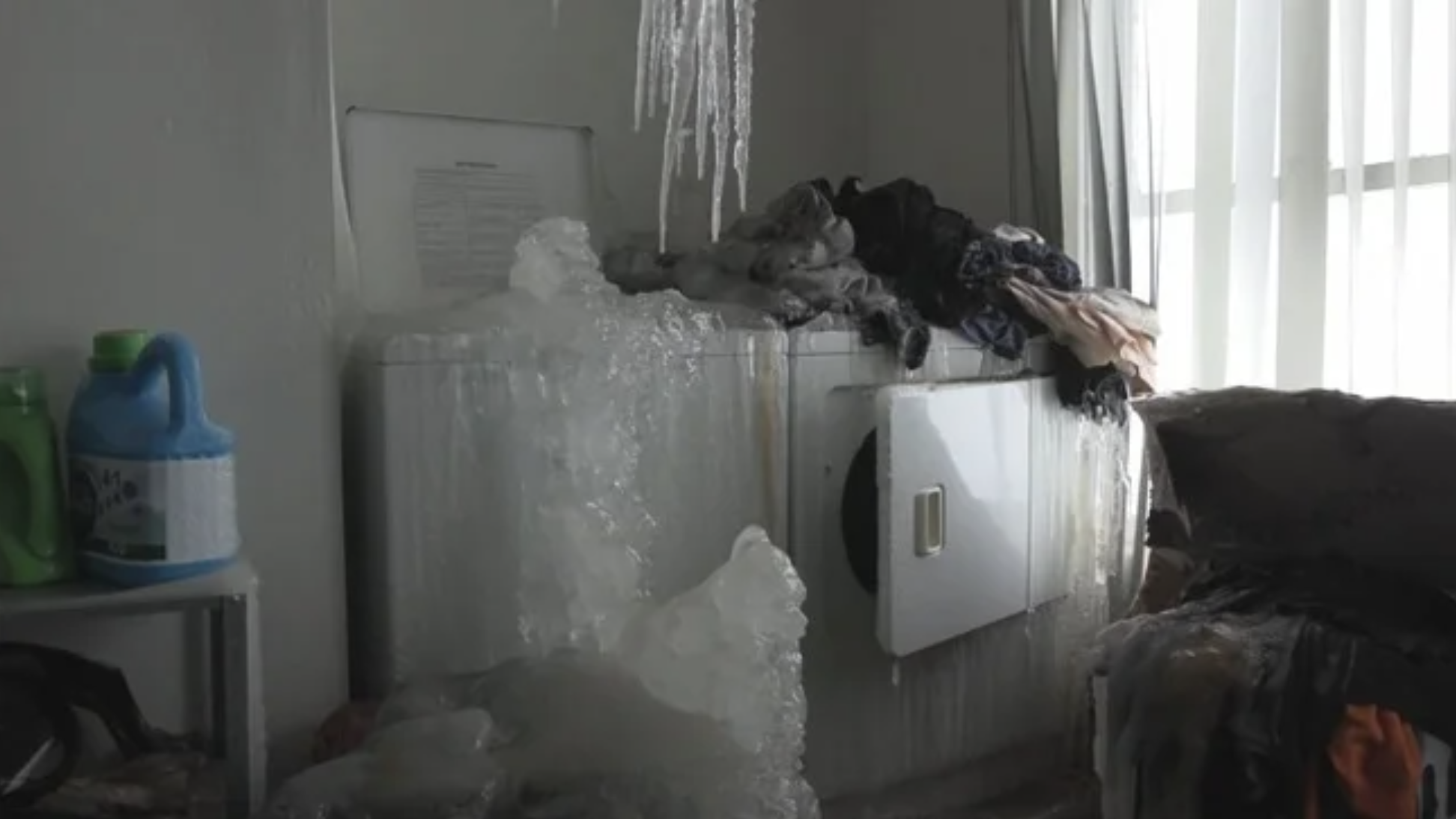 Without warmth, water inside the pipes froze, expanded, and caused them to burst. The escaping water immediately froze upon contact with the sub-zero temperatures, gradually accumulating into large masses that severely damaged the home.