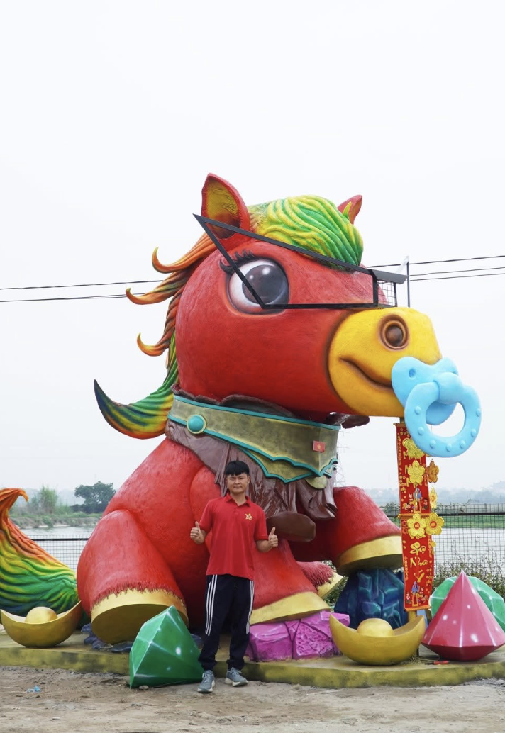 In his 10-hectare workshop in Hop Thinh commune (formerly Hiep Hoa, Bac Giang), 34-year-old Quan and his team are finalizing a collection of mascots for the Year of the Horse 2026. After successful dragon and snake sculptures in previous years, this year's project is larger, featuring three horse statues named: Hanh Phuc, Vui Ve, and Thuong.