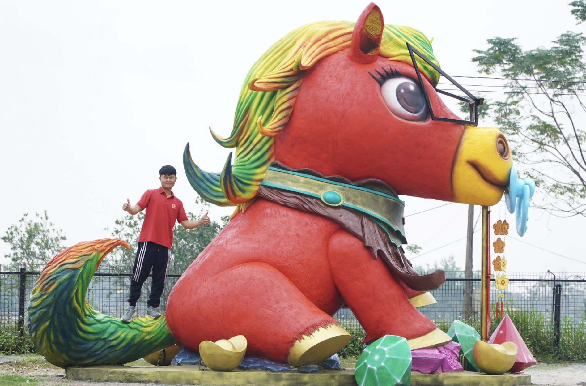 The giant horse trio project began in 6/2025. The most prominent piece, "Happy Horse", stands centrally, nearly 6 meters tall, weighs 10 tons, and features a dominant red hue. The other two statues, "Joyful Horse" (4 meters tall, 6 tons) and "Loving Horse" (5 meters tall, 5 tons), are currently in their sculpting phase.