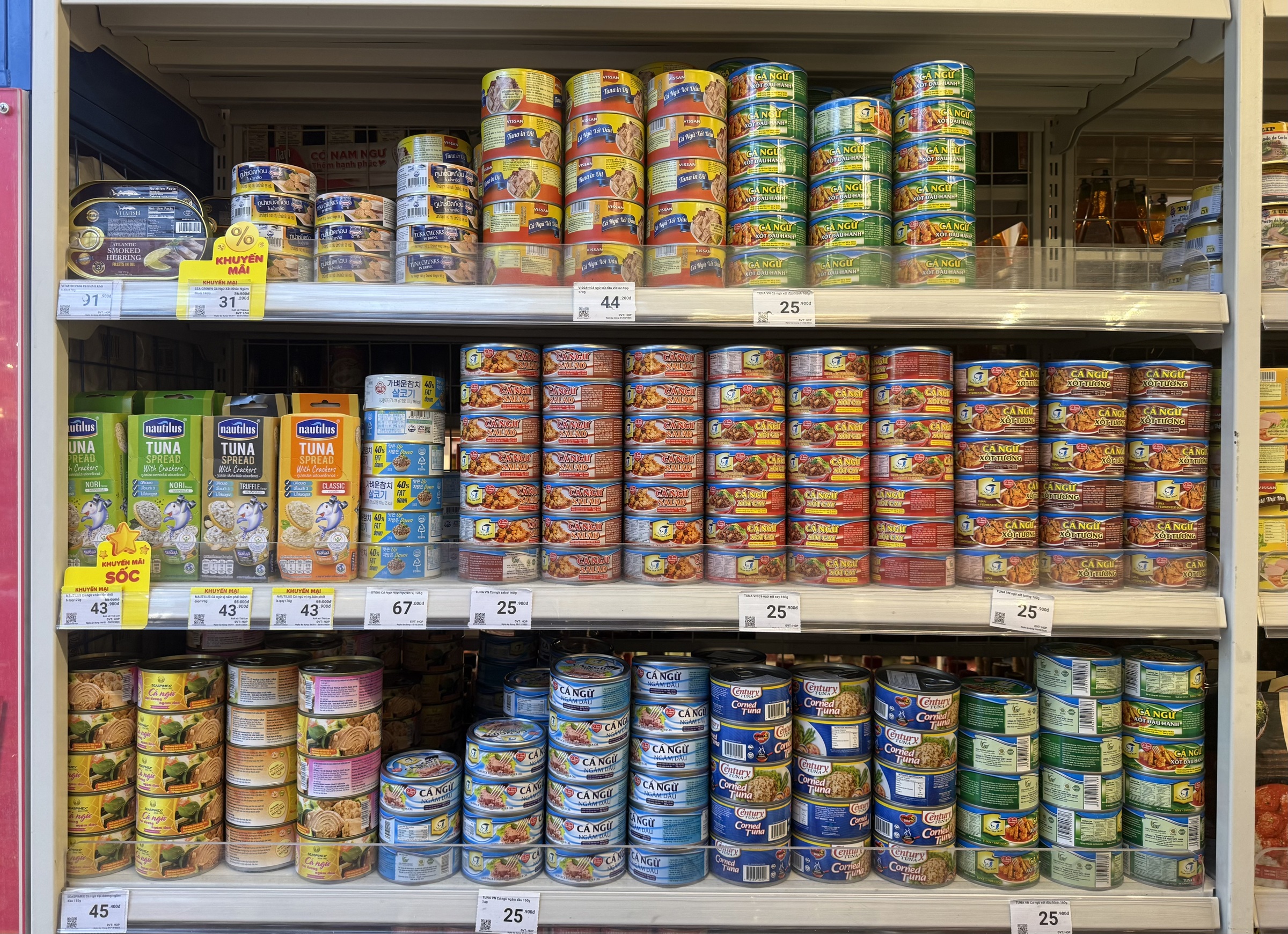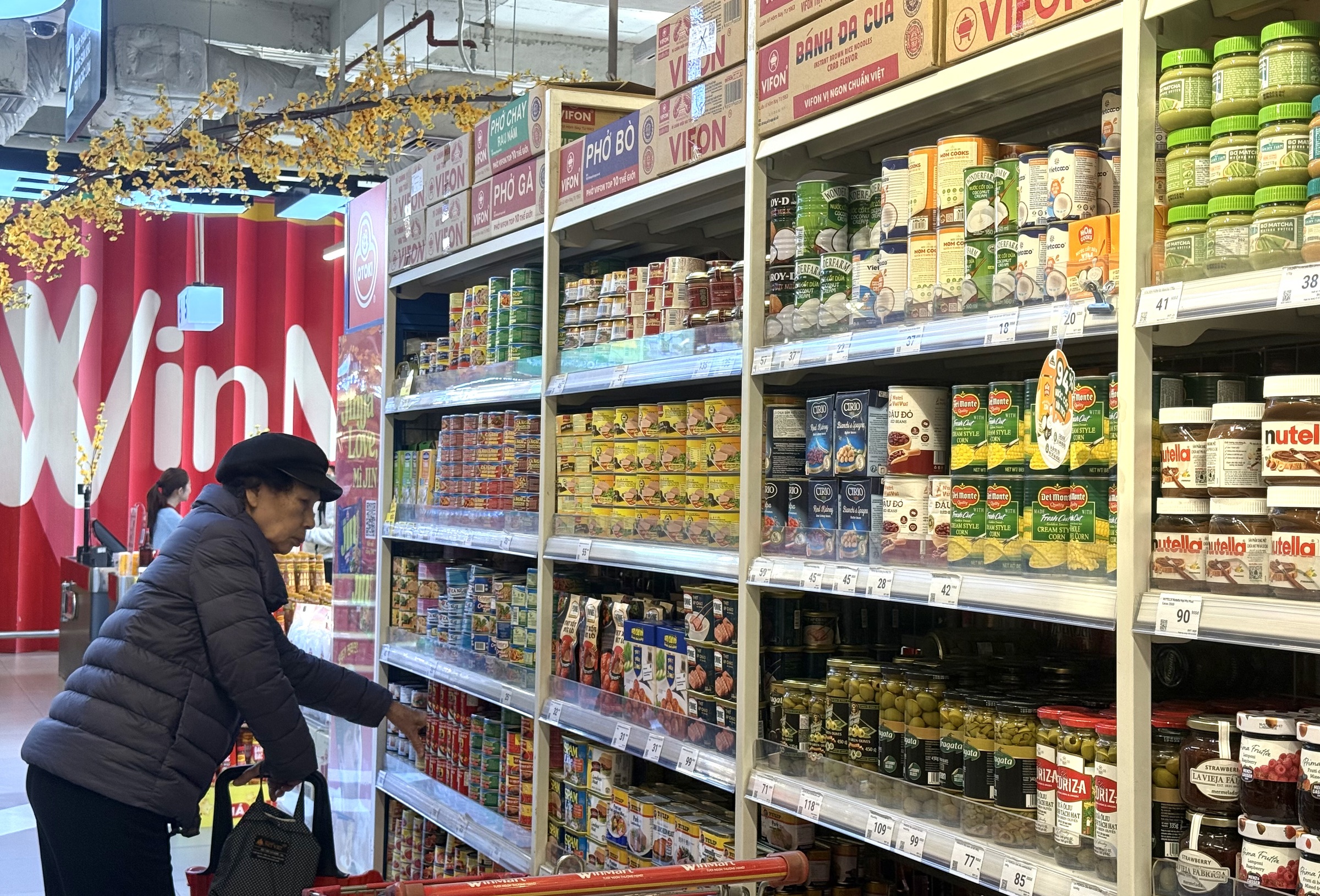 A resident purchasing instant canned products at a supermarket on Tran Dang Ninh street, Hanoi, on the afternoon of 8/1. *Photo: Quynh Nguyen*