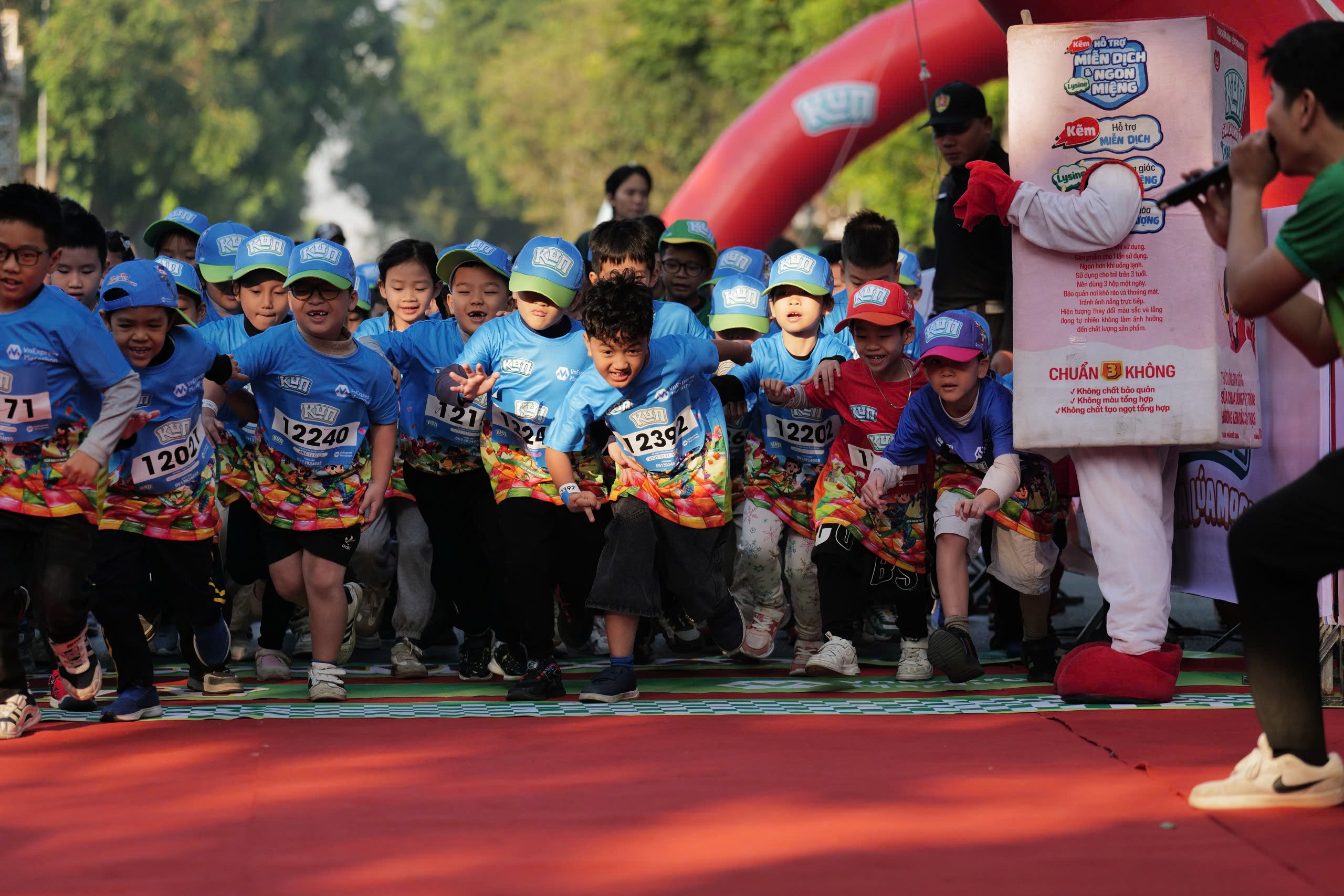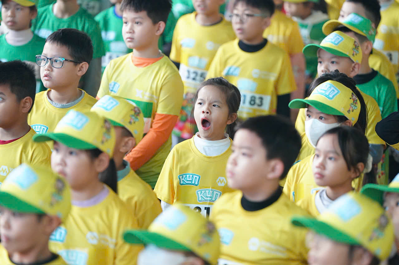 From 6:30 AM, 2,000 children aged 6-10 gathered on Tran Nhan Tong walking street. Many woke up as early as 4:00 AM to prepare, conquering sleepiness—the first challenge of race day.