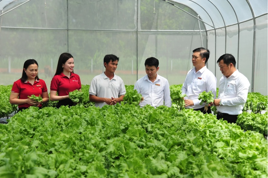 Agribank officers visit Le Van De's hydroponic vegetable farming model. Photo: Agribank |