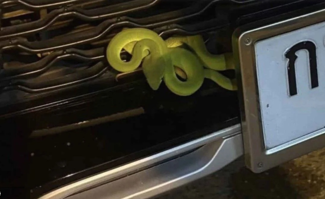 The green viper stuck in the car's grill on 14/9. Photo: thethaiger