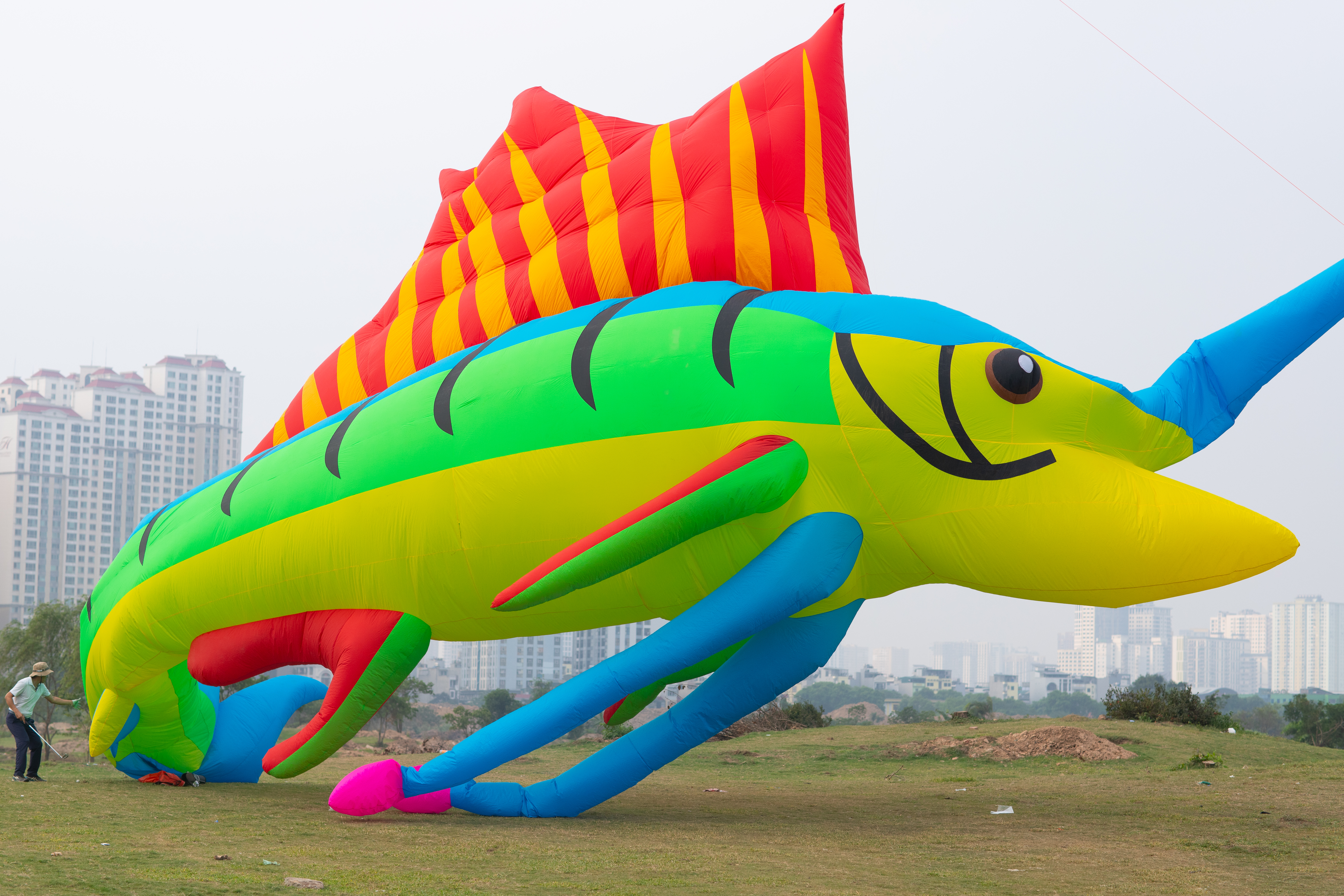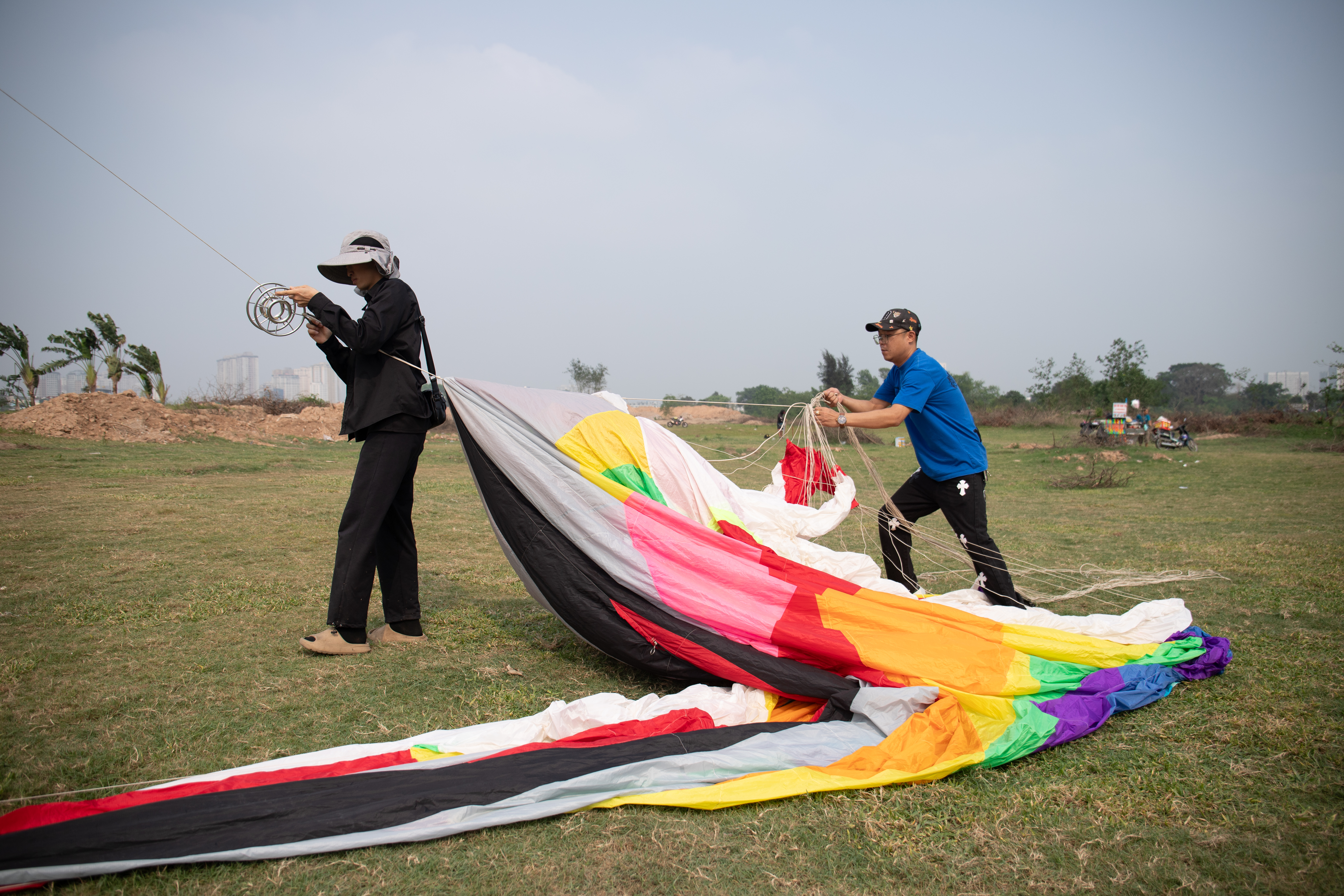 Adjacent to the area for small kites (with a wingspan under two meters) is a dedicated space for giant kites. Nguyen Duc Cuong, 39, leader of Hanoikiteteam, brought large aerodynamic kites, measuring 16-30 meters in length and with a 15-meter wingspan, to fly with his members. They arrived at noon to measure wind direction and speed, preparing for flight and selecting a wide, open location.