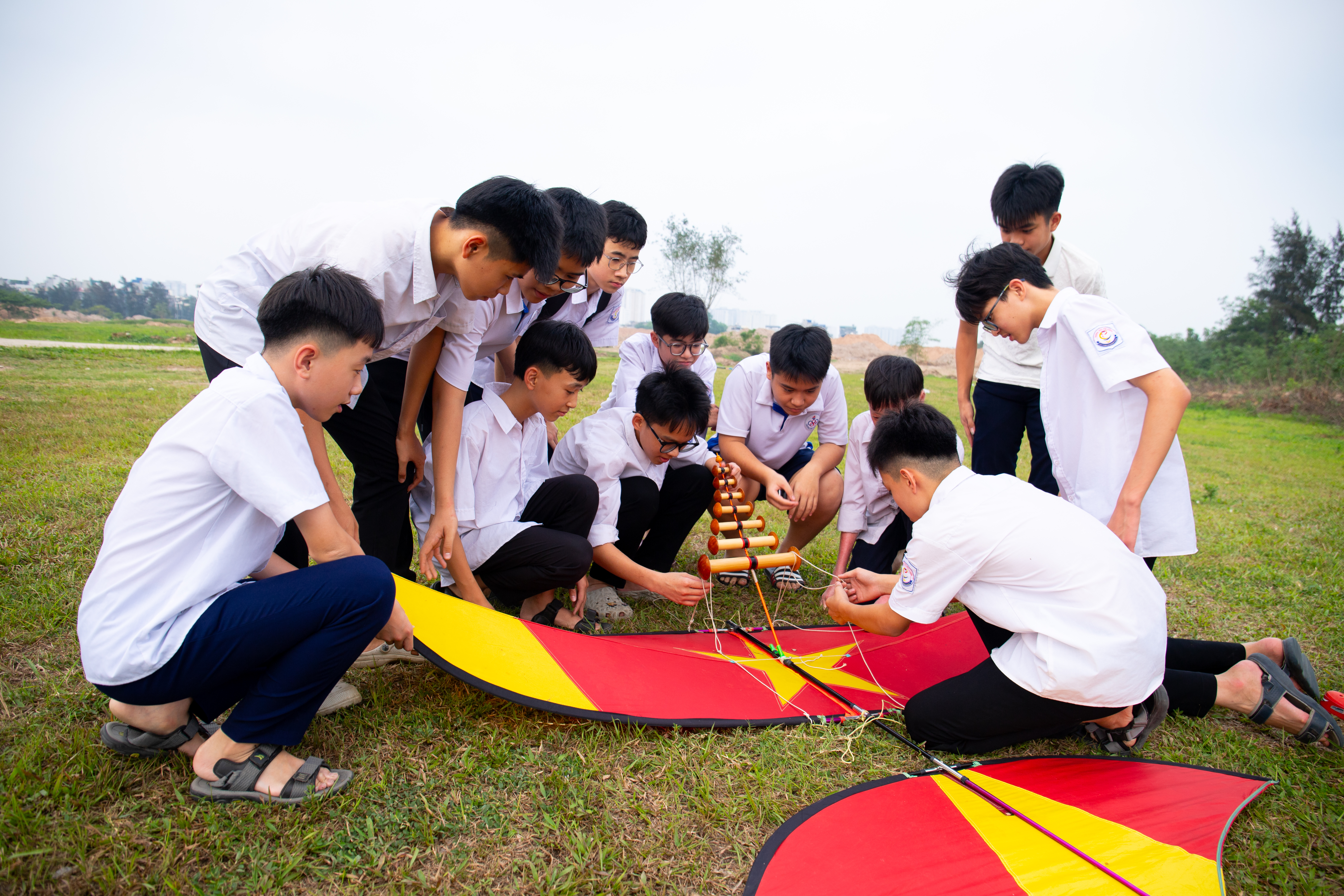 A group of students from classes 8A1 and 8A2 of Phu Cuong Secondary School brought kites printed with the national flag to the field after school. Minh Quan said, "We relieve academic pressure through this game." |