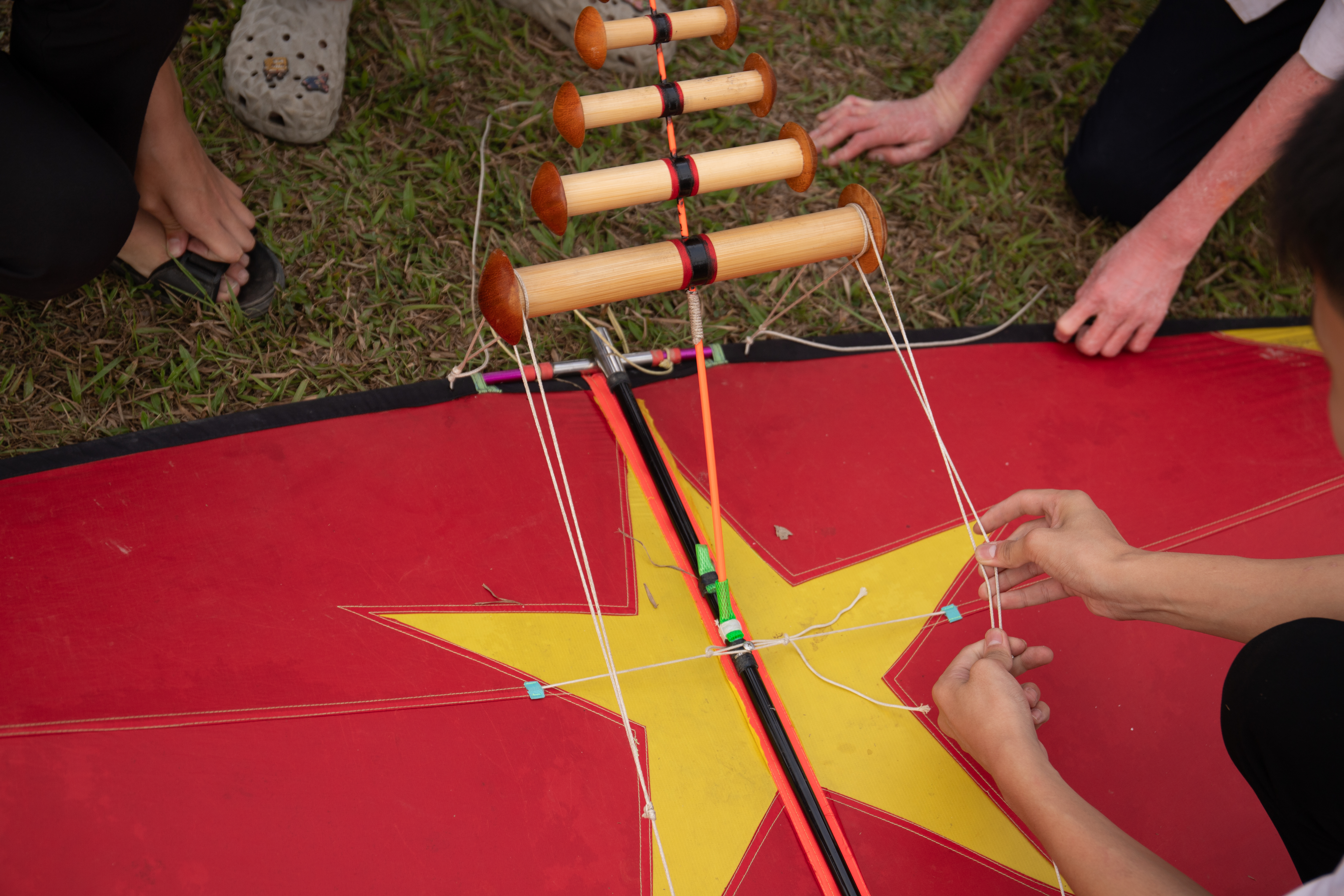 The group of students attached flutes to their kites before flying them. |