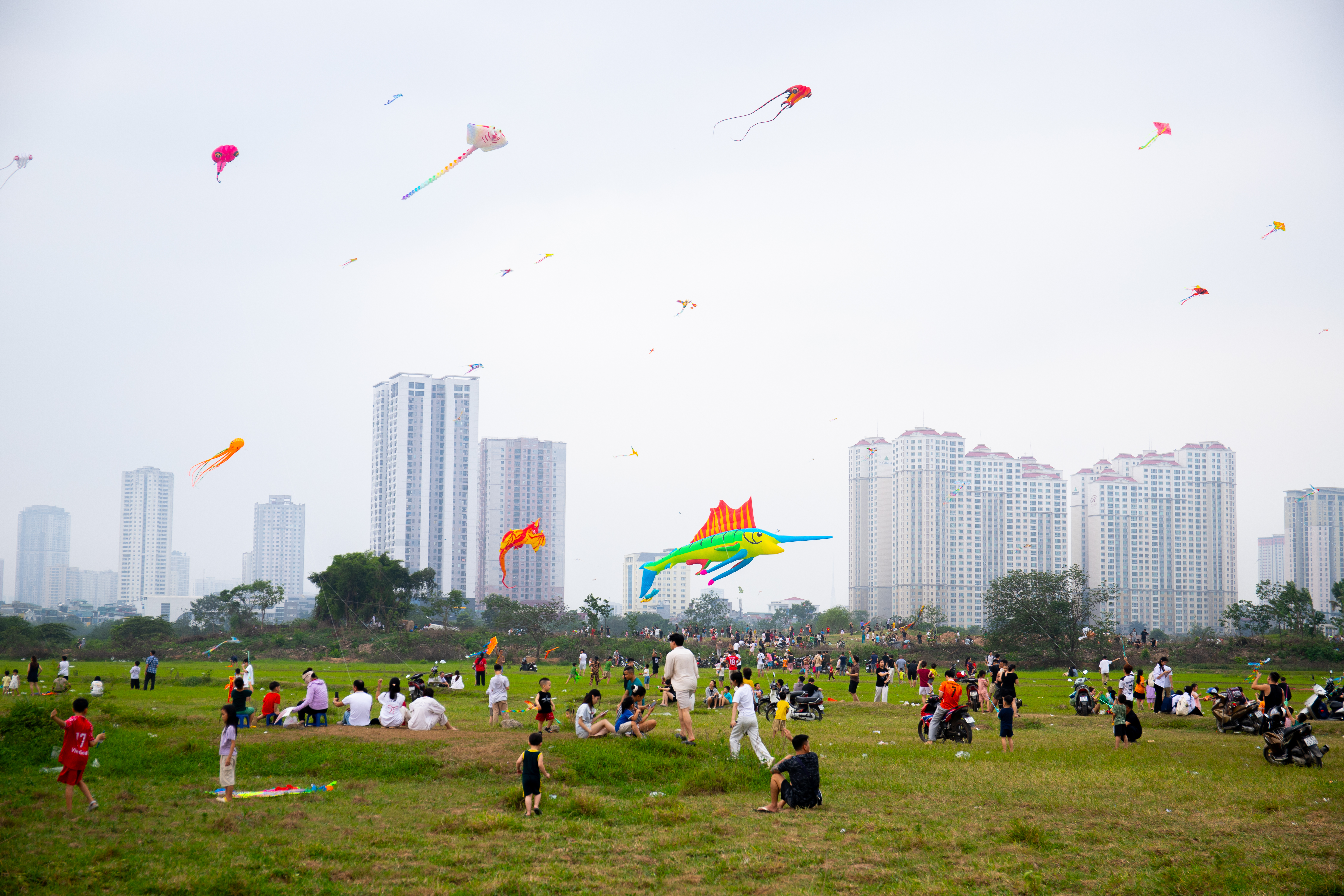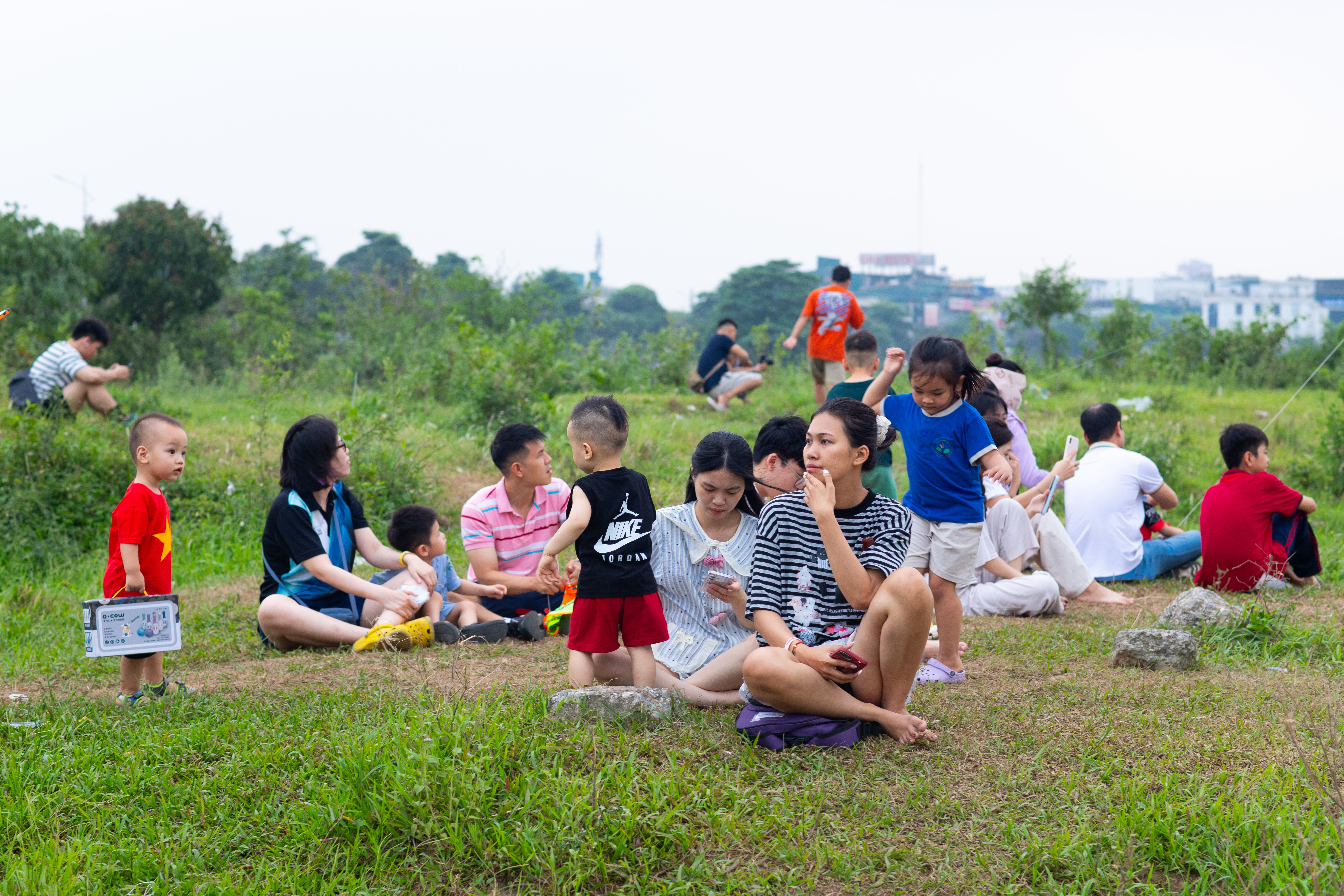 Beyond the kite-flying groups, many families bring their children to the field to enjoy the scenery and play after school. |
