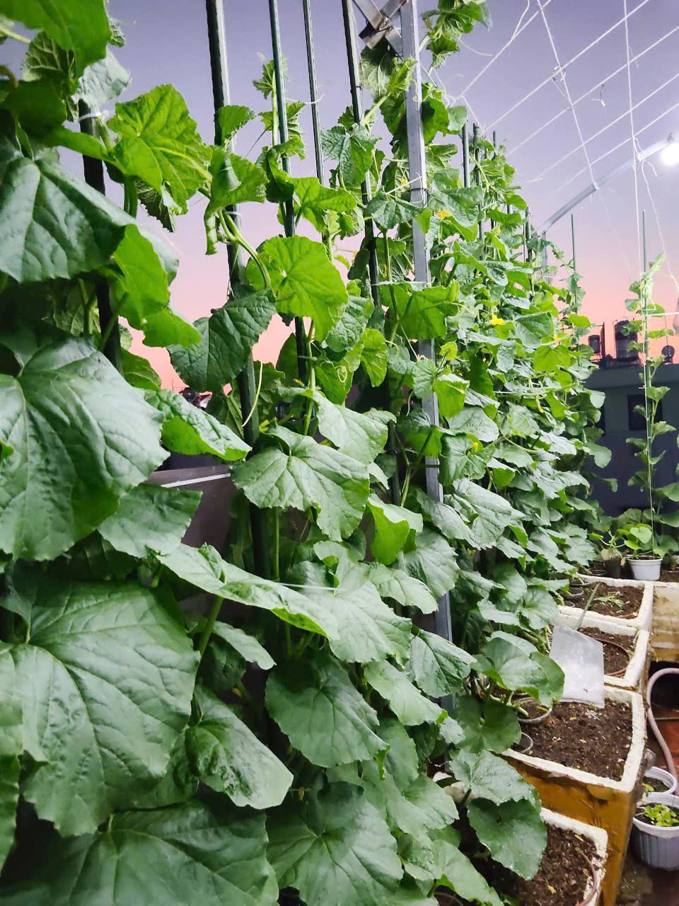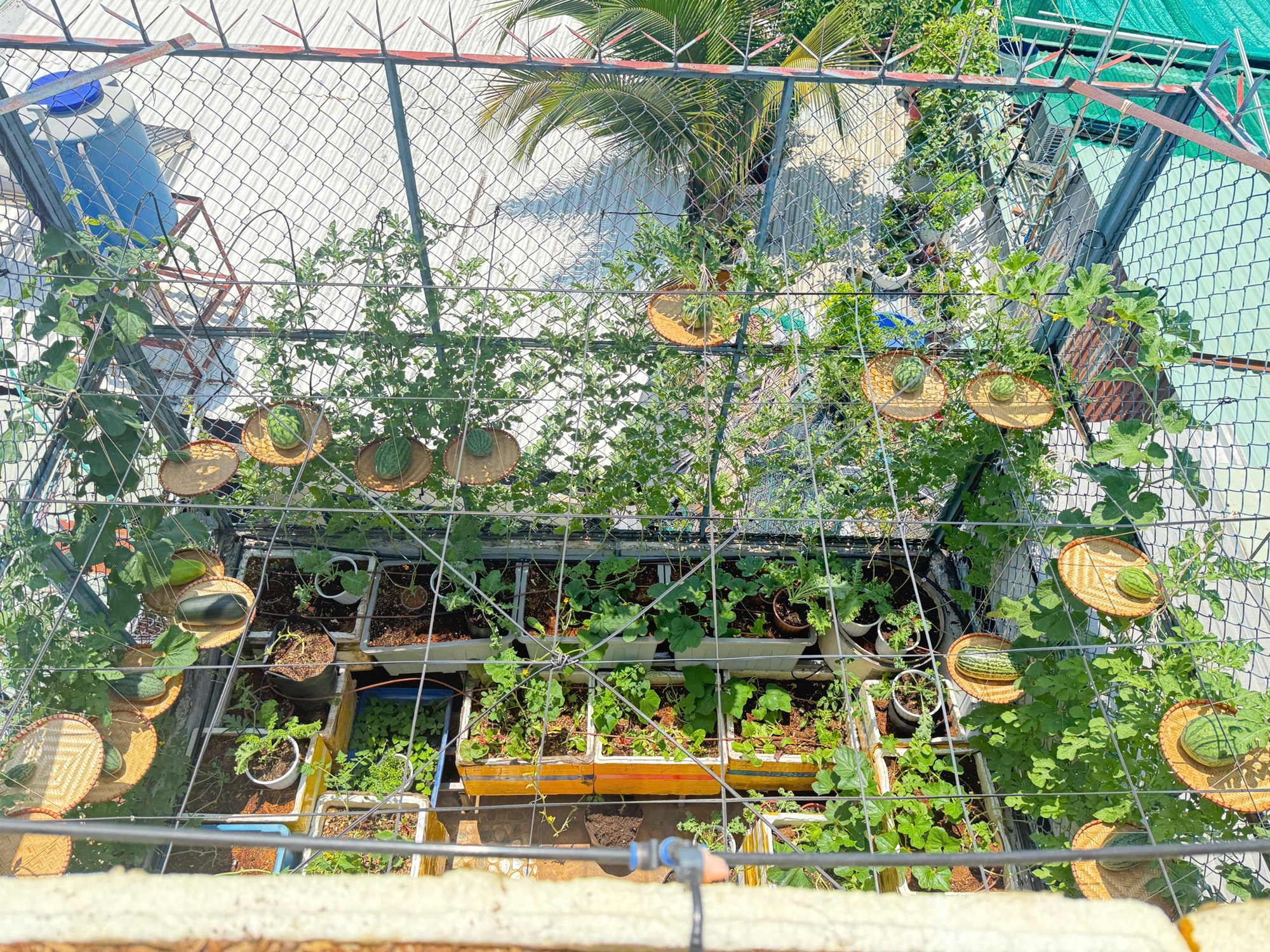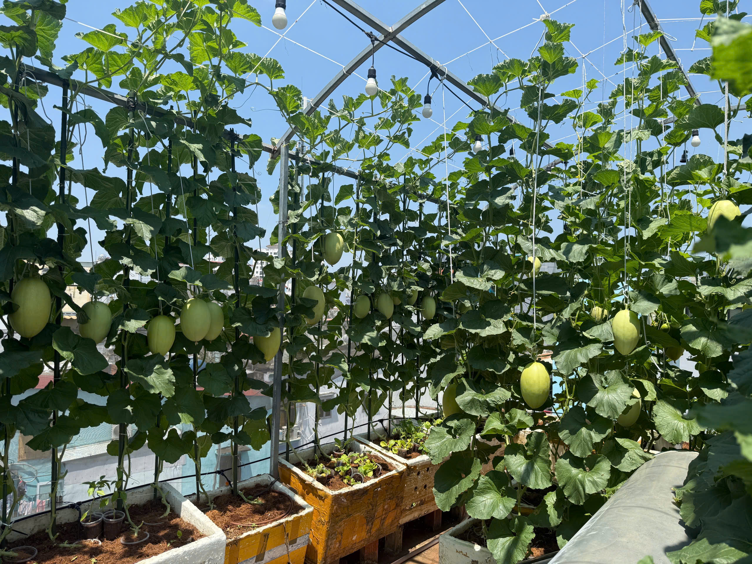 The rooftop garden is divided into three main areas, including: netted melons, watermelons, cantaloupes, and muskmelons. Currently, the garden features 6 types of melons, with about 150 plants, equipped with an automatic irrigation system.