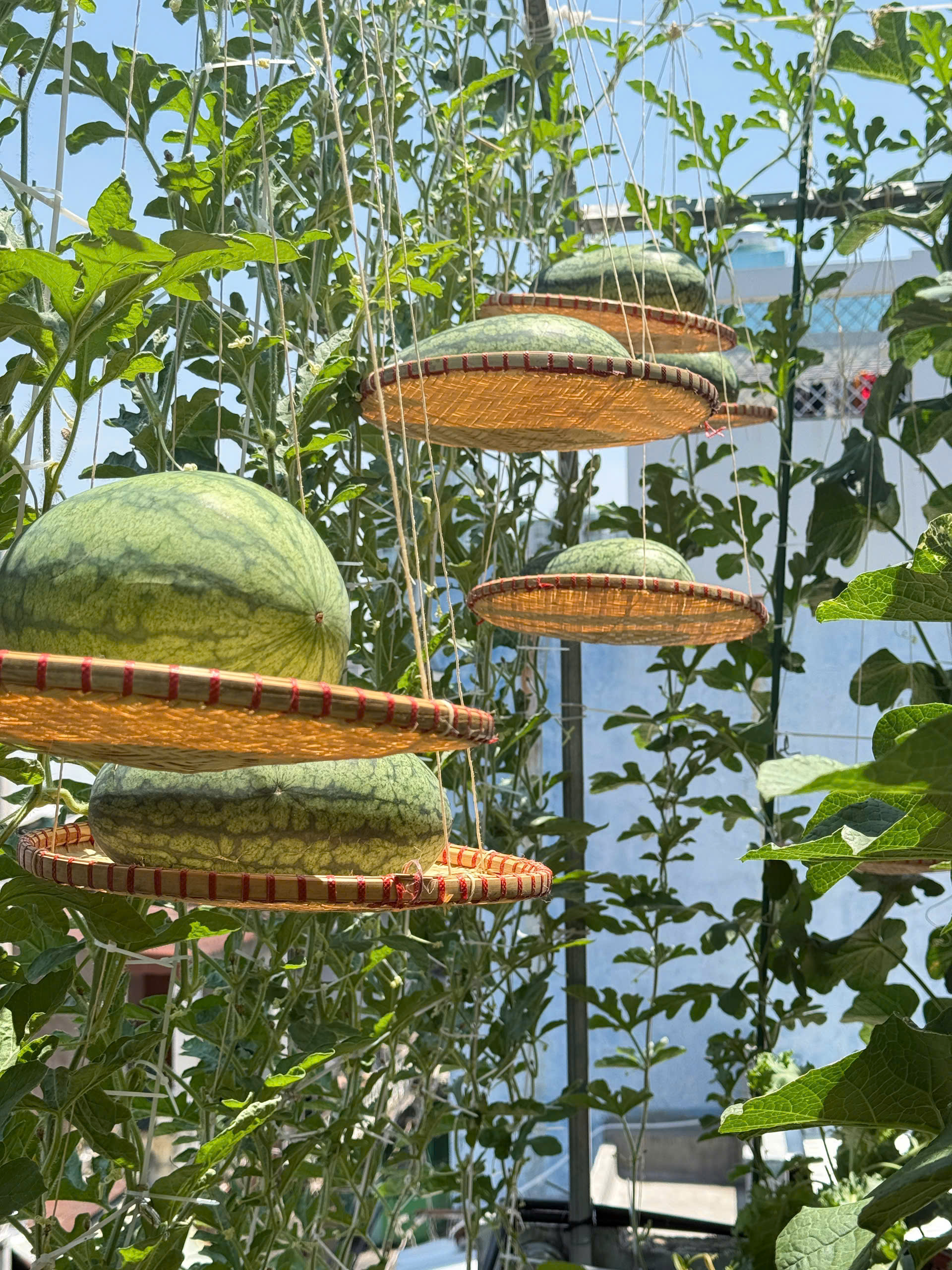 For the watermelon section, the gardener uses dozens of bamboo trays to support the ripening fruit.