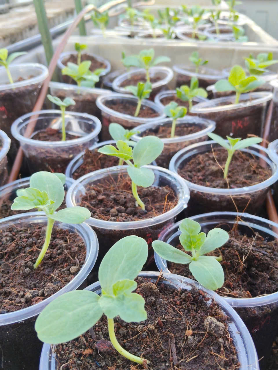 She germinates seeds in a self-mixed growing medium within plastic cups, watering them twice daily. Once the seedlings develop cotyledons, she transplants them.