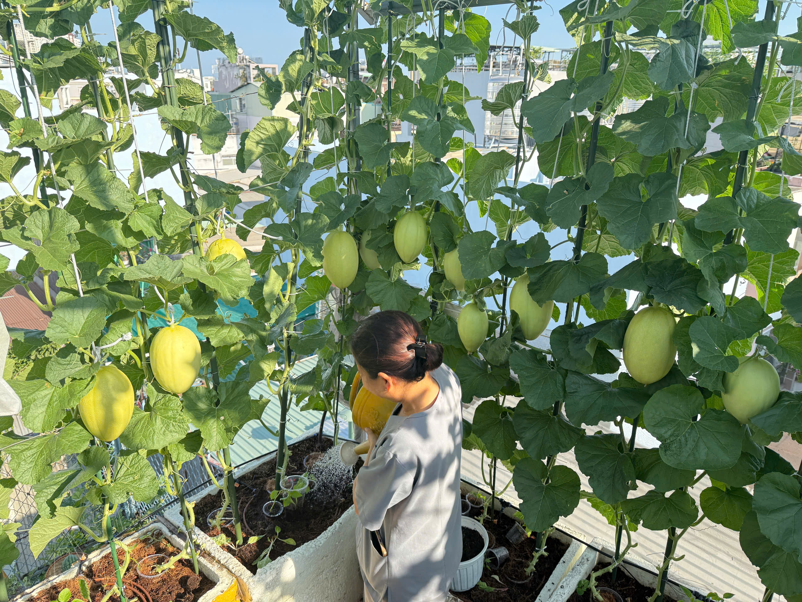 After celebrating Tet 2026, Huynh Thi Minh Thua, 43, a dentist in Hoa Binh ward, began her third melon growing season on her rooftop.