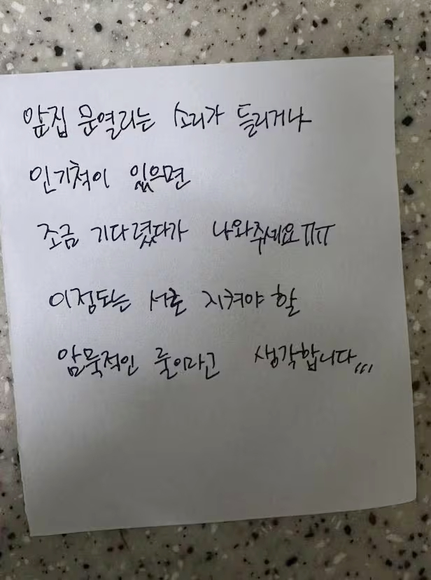 A note a family in South Korea received from a neighbor in early 10/2025. Chosun |