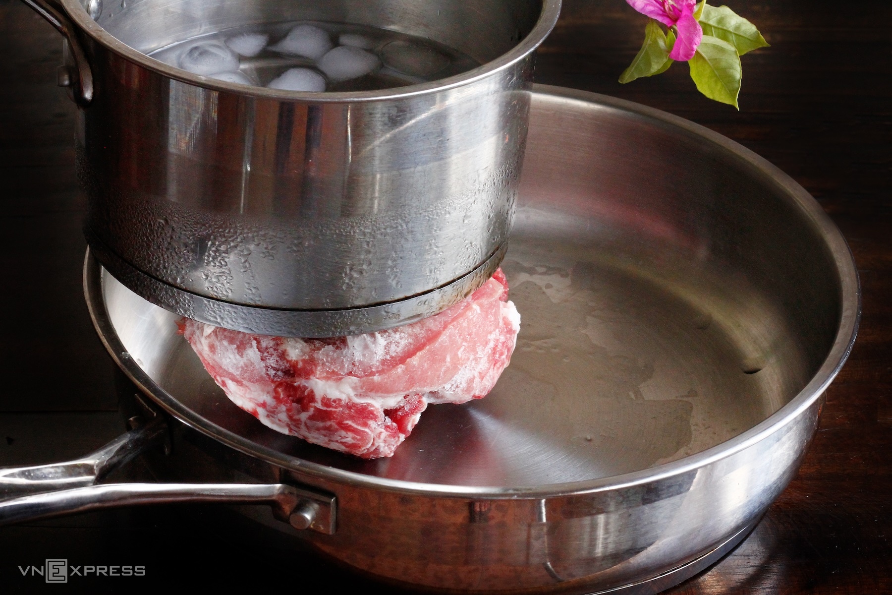 You can quickly thaw food while preserving its flavor using the "reverse ice" technique. Simply sandwich the meat between two metal pans, the top pan filled with cold water and ice. After 20-30 minutes, depending on the meat's thickness, it will be as tender and fresh as if newly purchased.