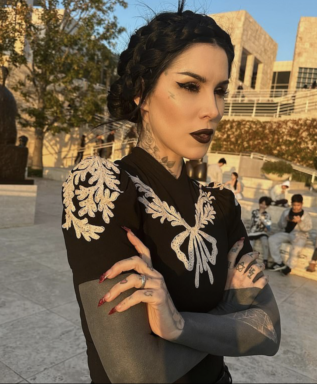 Kat Von D spent 40 hours getting blackout tattoos to cover almost all of her limbs, obscuring previous tattoos that covered 80% of her body. Photo: Kat Von D/Instagram