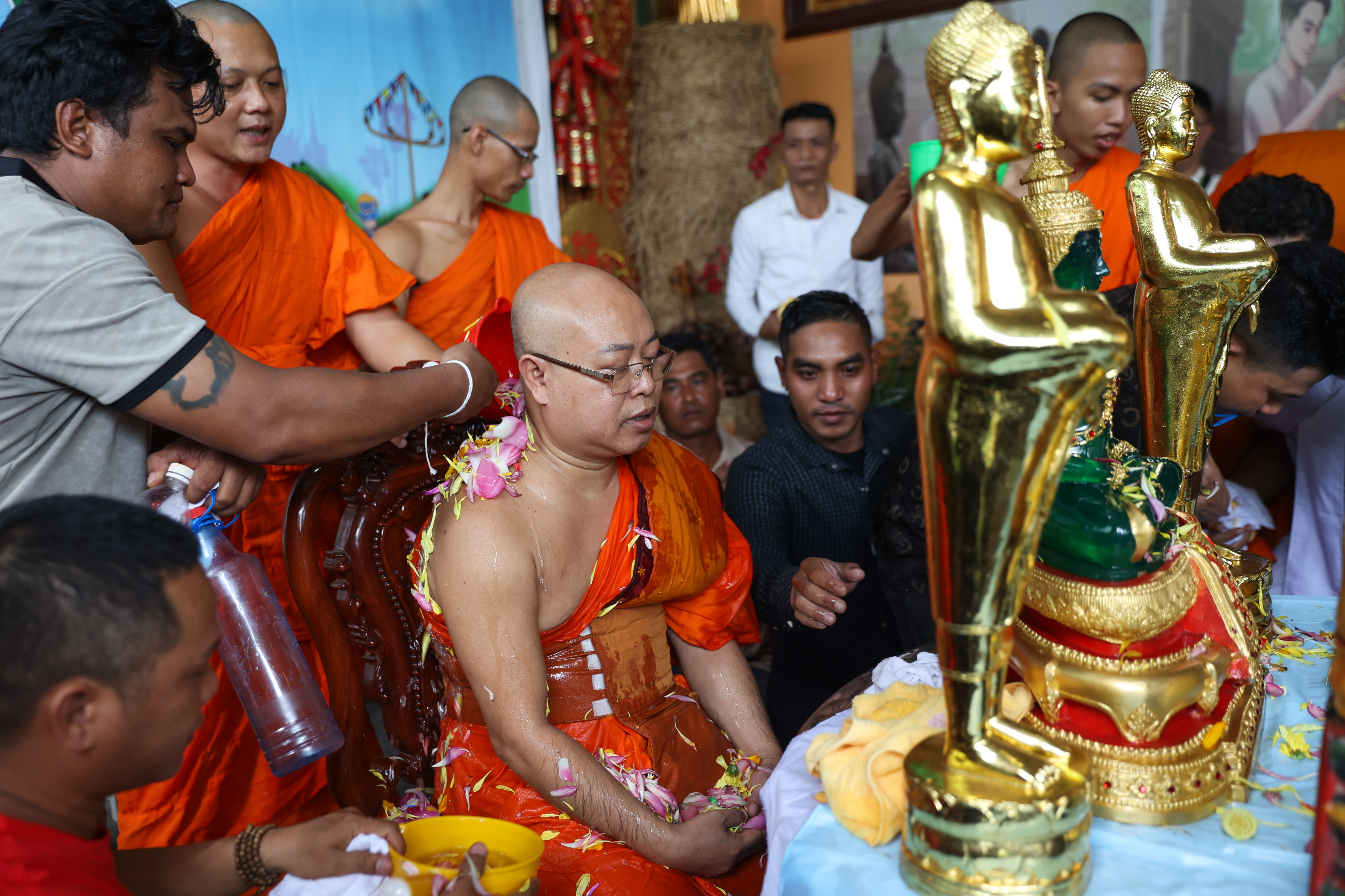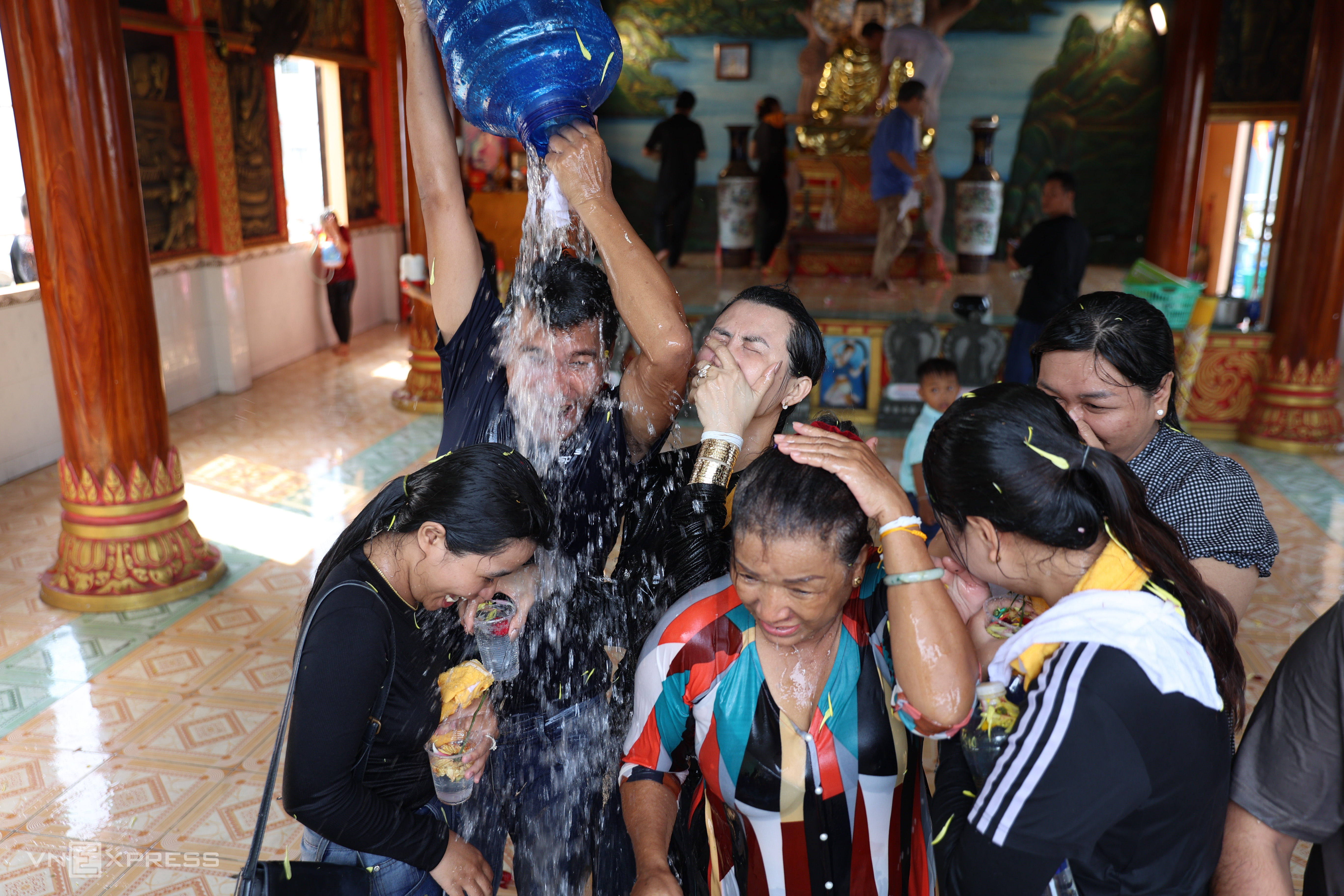 After bathing the statues, Buddhists use flower petals to sprinkle water onto elderly monks. In Khmer culture, this bathing ritual symbolizes wishing longevity and blessings upon older monks in the new year.