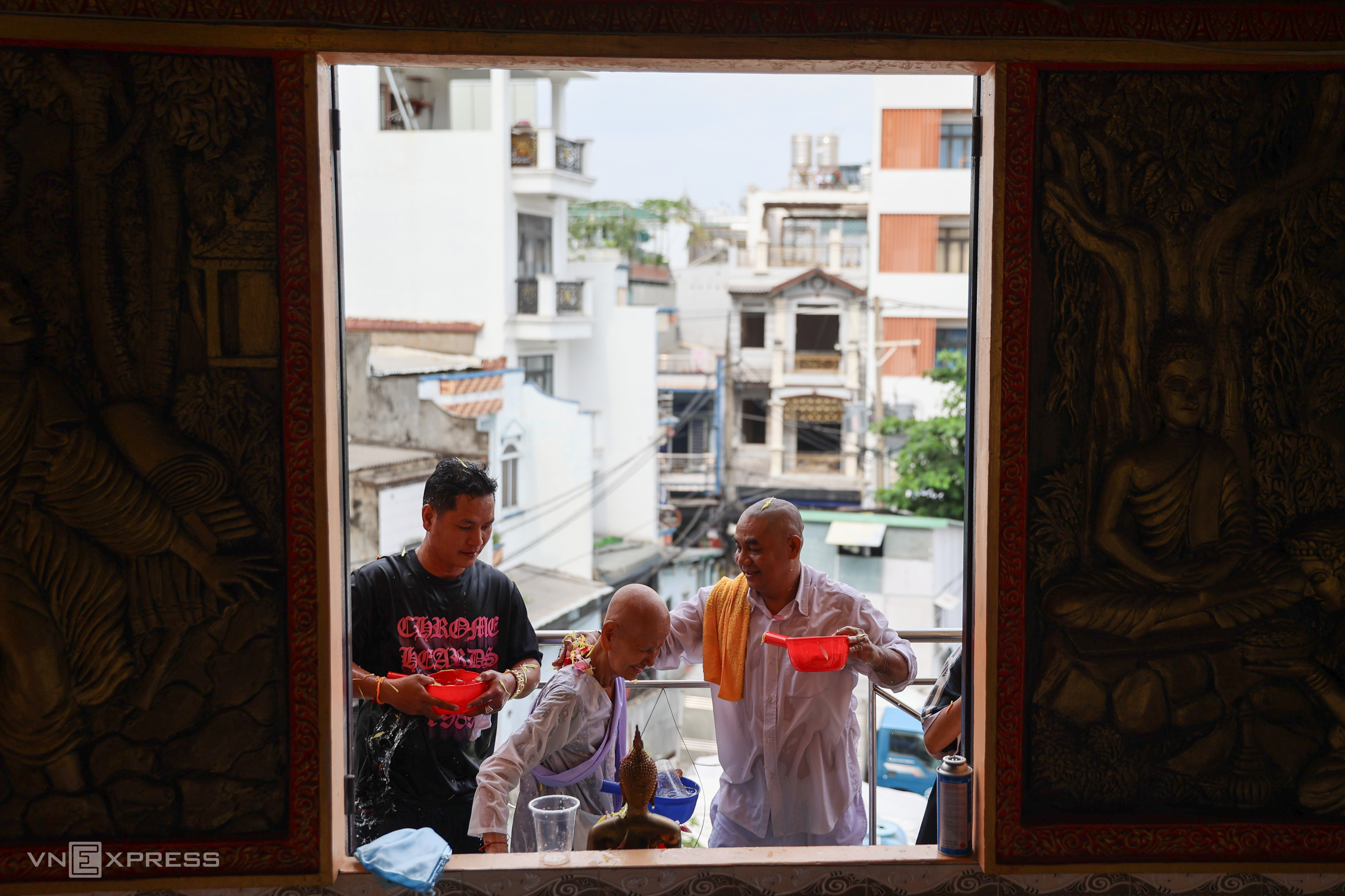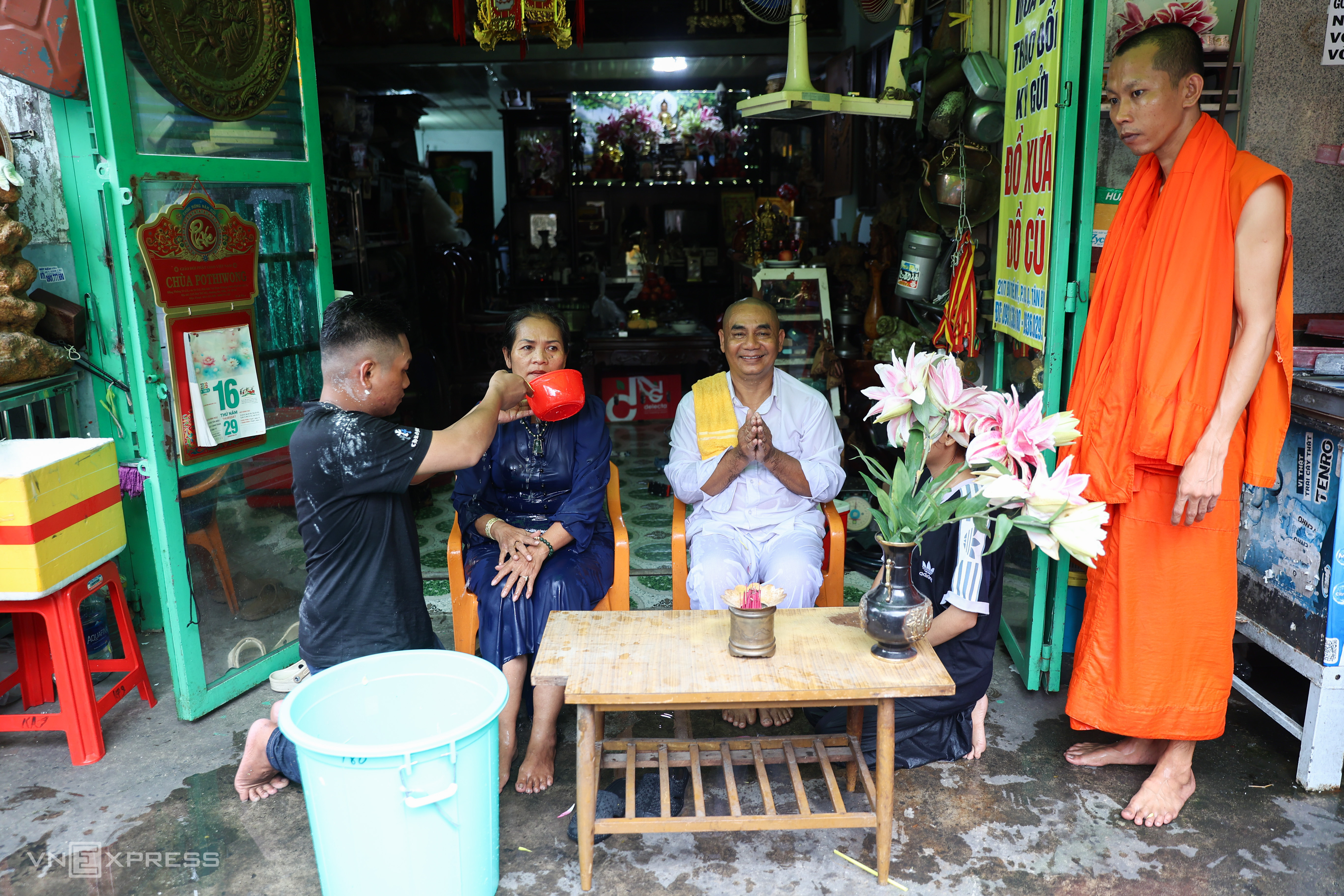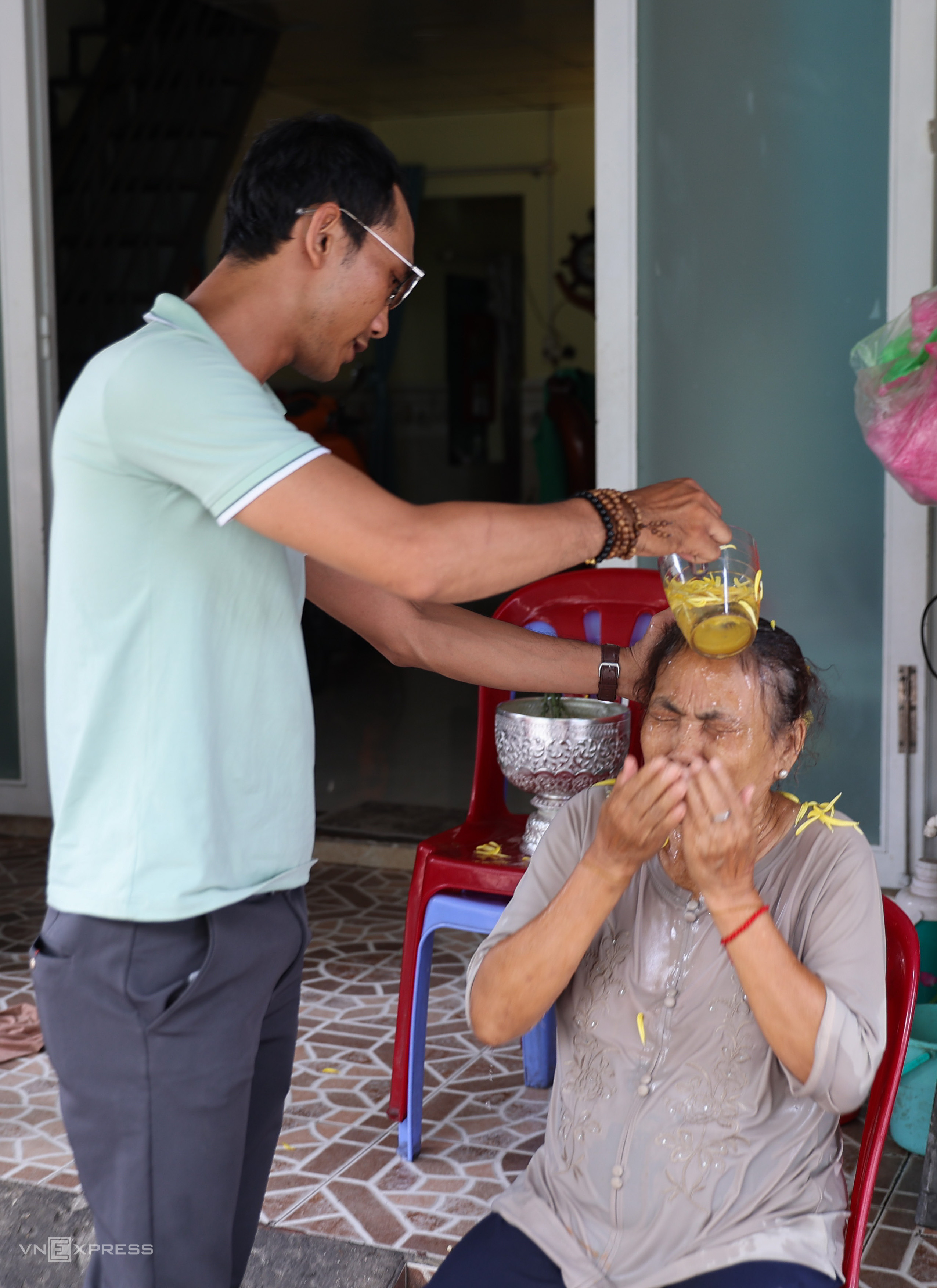 Cai's family, originally from Soc Trang, has lived among the Khmer community on Bui The My street for 38 years. Her husband passed away 16 years ago, and 14 family members live together. After her return from the pagoda, her children prepared basins of water with added chrysanthemum petals to bathe her.
