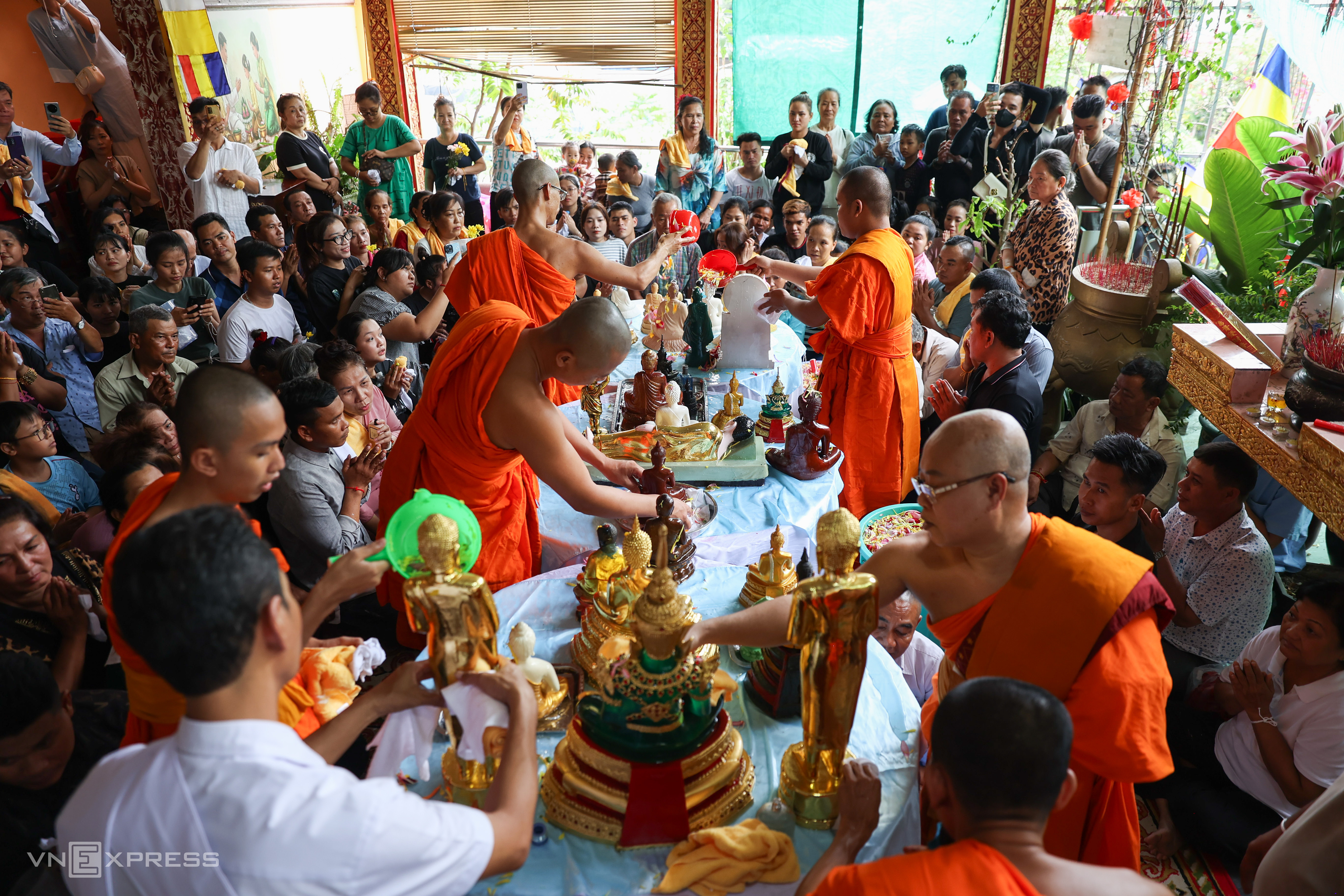 Bathing Buddha statues is the most anticipated ceremony during Chol Chnam Thmay. Many Khmer people wait for hours at the pagoda to perform this sacred ritual. Buddha statues from the pagoda and those brought by locals are arranged in rows, fragrant water is poured over their heads, then they are wiped clean. This belief symbolizes purification, washing away "dust" from one's consciousness.