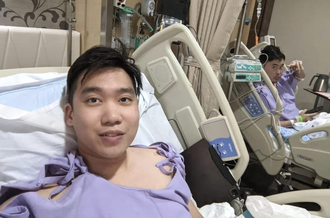 Tew (left) after surgery with Pang at Mount Elizabeth Hospital, Singapore. *Photo: Strait Times* |
