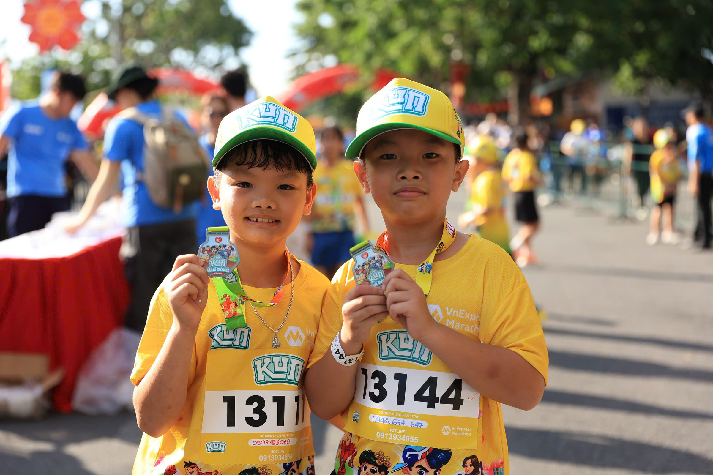 Children receive medals after finishing the race. Photo: VnExpress Marathon |