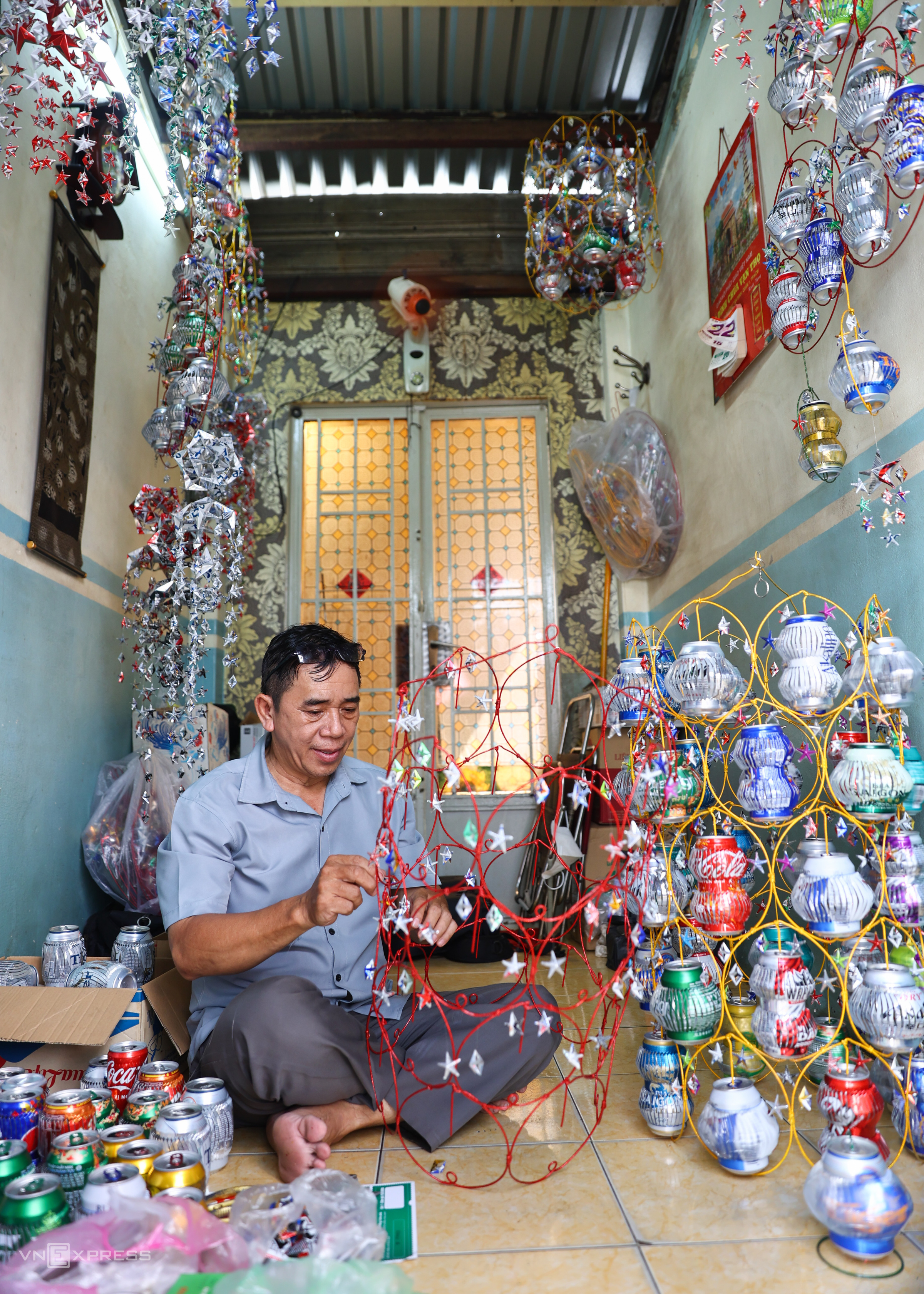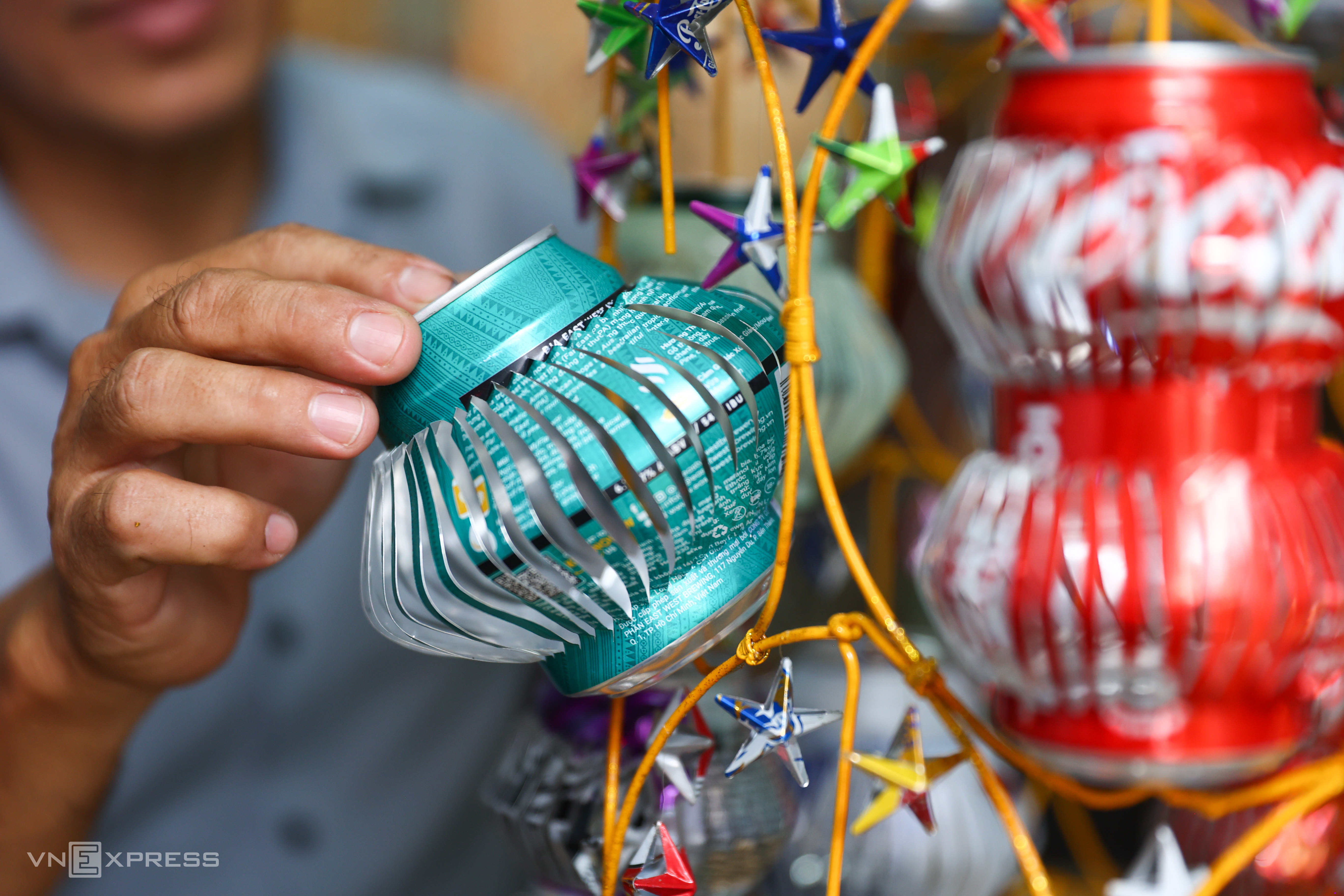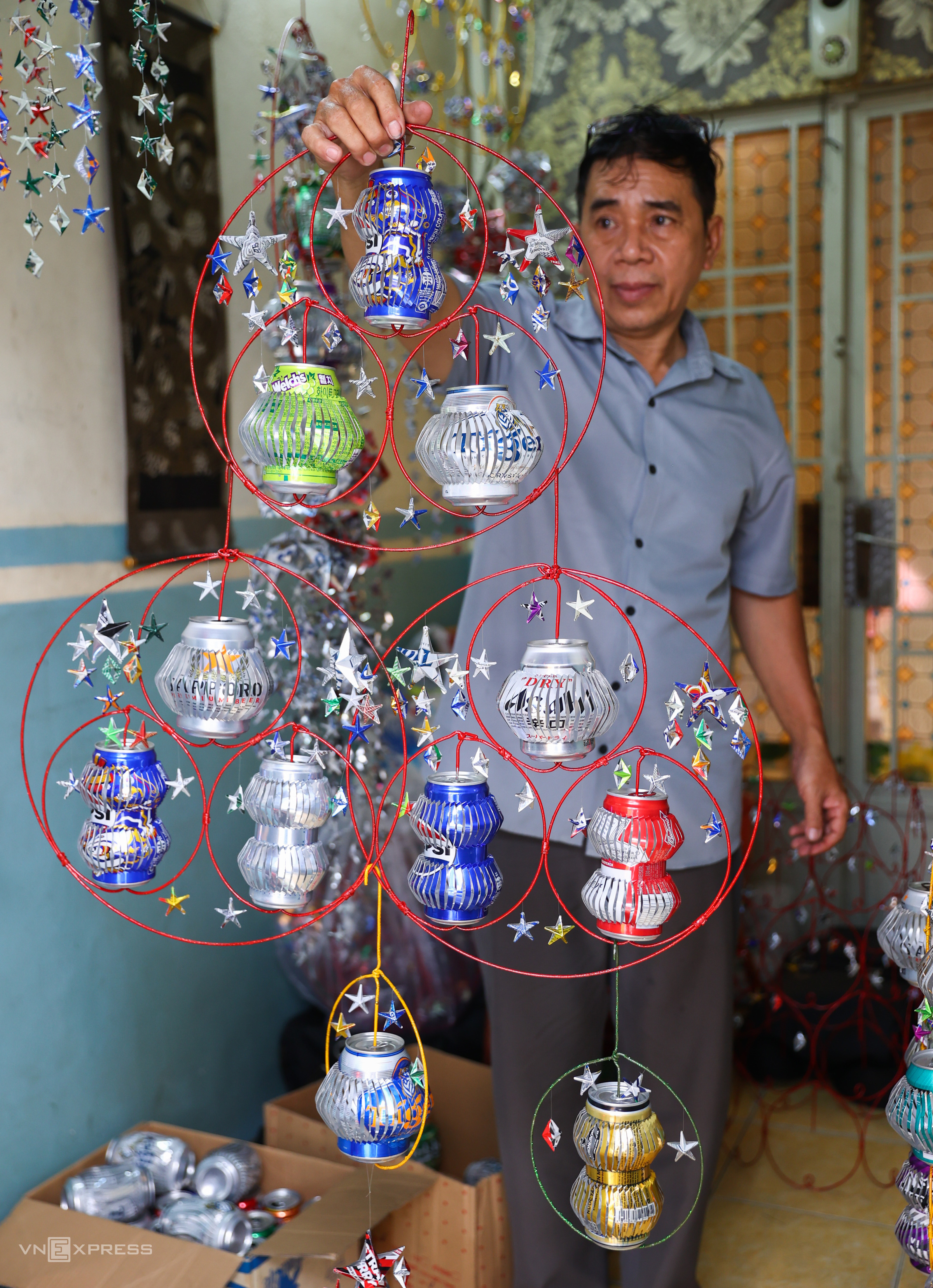 In the photo, Tuan displays a lantern made from 40 cans, priced at 1.6 million VND, which took him two weeks to complete. "Initially, I made traditional mid-autumn festival lanterns from cans, and gradually, I developed my own style to satisfy my personal interest," the 56-year-old explained.